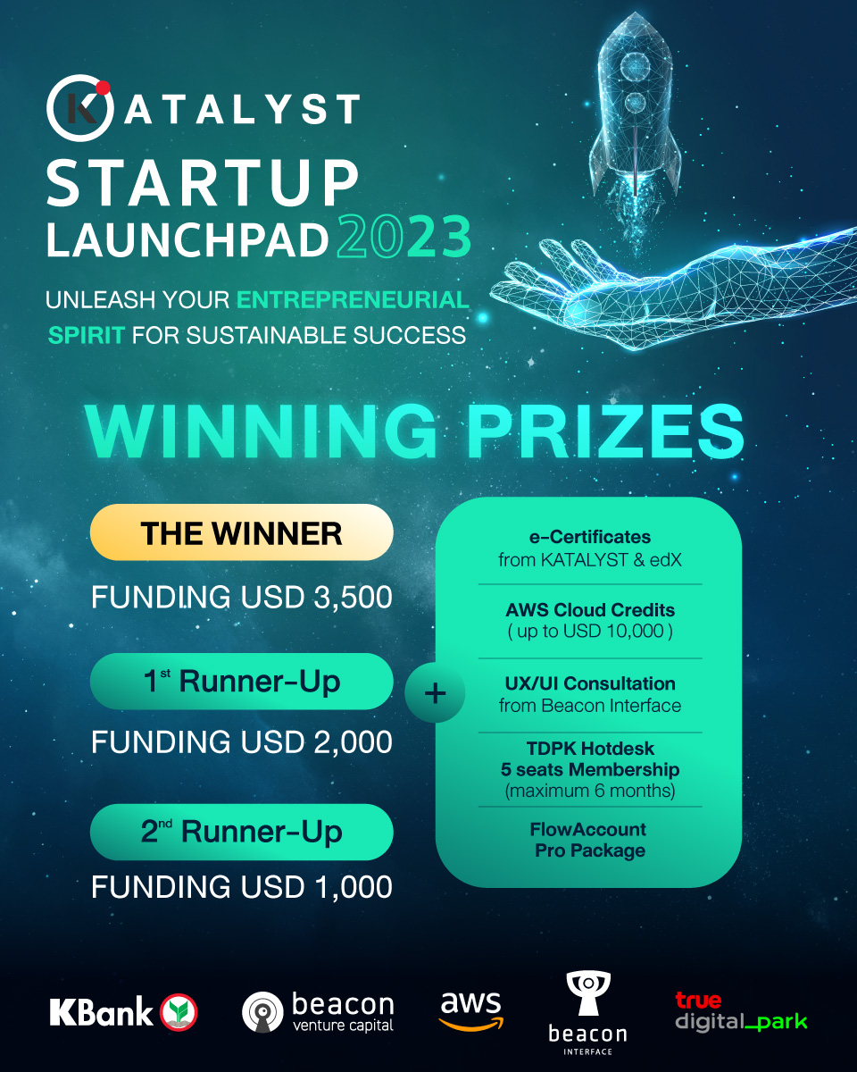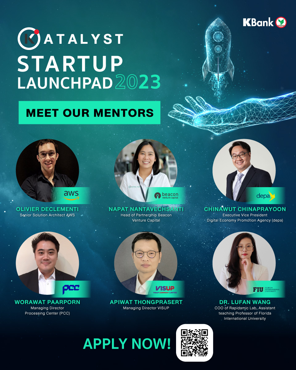 กสิกรไทยมุ่งมั่นเสริมแกร่งสตาร์ทอัพไทยปรับตัวให้เปลี่ยนผ่านสู่ความยั่งยืน และก้าวทันเทคโนโลยี เดินหน้าโครงการ KATALYST STARTUP LAUNCHPAD 2023 ถ่ายทอดการพัฒนาศักยภาพทางธุรกิจระดับโลกใน 9 สัปดาห์ ฟรี โดยผู้เข้าอบรมทุกคนจะได้รับความรู้ และสิทธิประโยชน์ต่างๆ เพื่อต่อยอดธุรกิจ รวมถึงโอกาสนำเสนอโครงการเพื่อชิงเงินรางวัลพร้อมรับการสนับสนุนเครื่องมือในการทำธุรกิจ รวมมูลค่ากว่า 1 ล้านบาท เปิดรับสมัครผู้เรียนเน้นเทคสตาร์ทอัพในกลุ่มอุตสาหกรรมการเงิน (FinTech) สิ่งแวดล้อม (ESG และ Green Technology) ปัญญาประดิษฐ์ (Artificial Intelligence และ Machine Learning) เทคโนโลยีด้านสุขภาพ (HealthTech) และโซลูชั่นสำหรับองค์กร (Enterprise Solution) โดยตอกย้ำเจตนารมณ์ของธนาคารในการพัฒนาสตาร์ทอัพไทยให้แข็งแกร่งเพื่อร่วมเป็นกำลังขับเคลื่อนเศรษฐกิจสร้างความยั่งยืน
