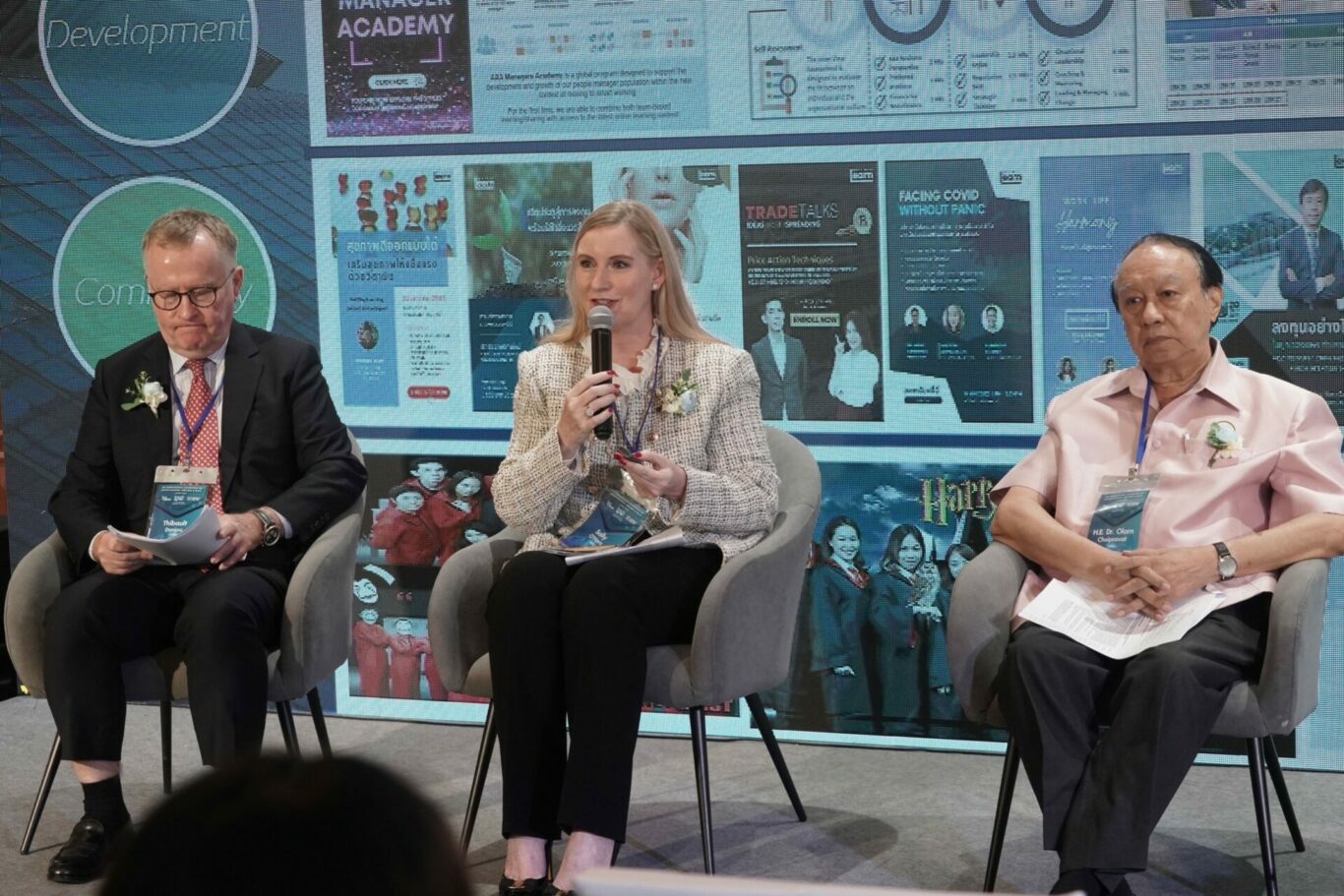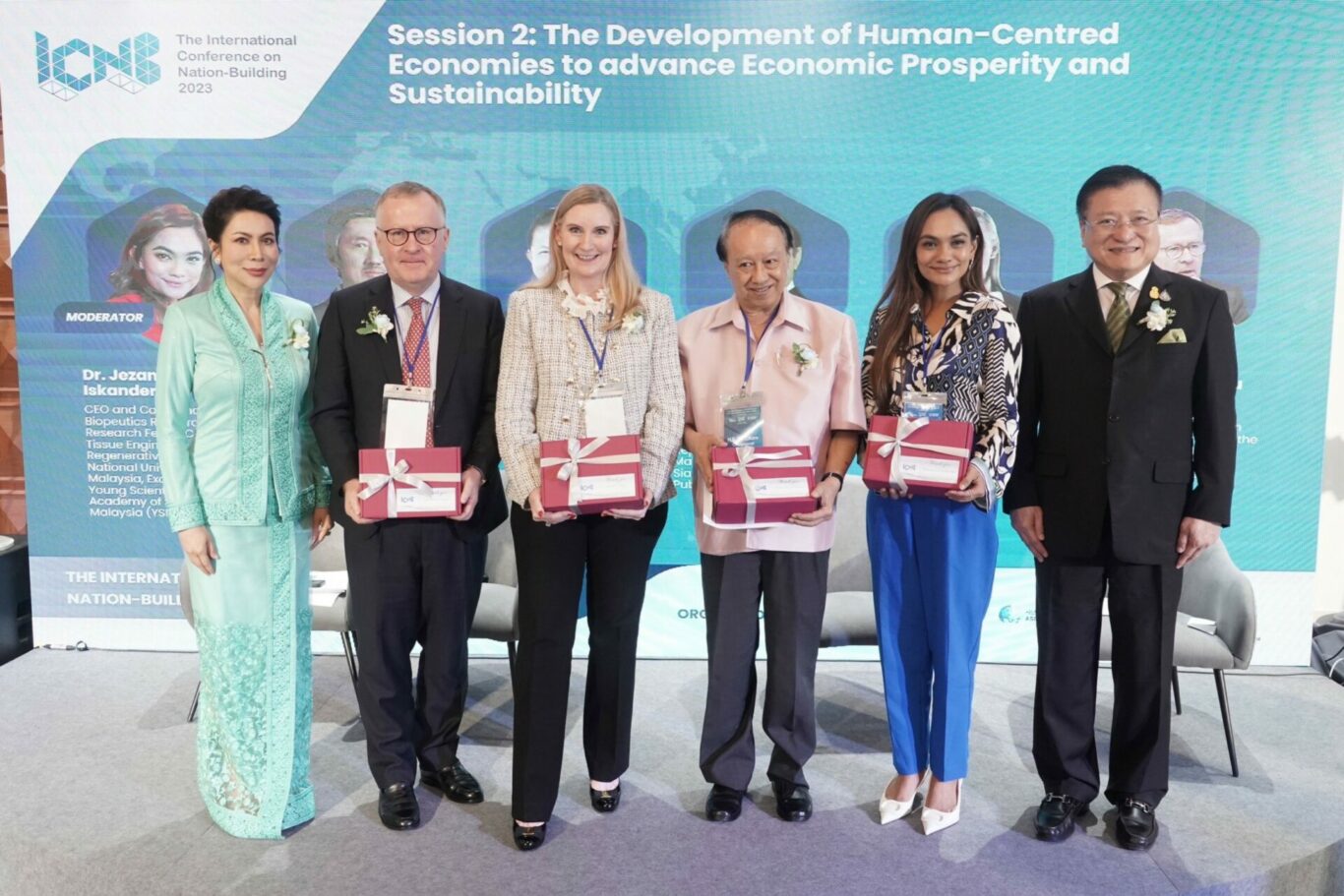 บมจ.กรุงไทย-แอกซ่า ประกันชีวิต นำโดย นางแซลลี่ โอฮาร่า ประธานเจ้าหน้าที่บริหาร (ที่3 จากซ้าย) เข้าร่วมเป็นหนึ่งในผู้บรรยายพิเศษ ภายใต้หัวข้อ “The Development of Human-Centred Economies to advance Economic Prosperity and Sustainability” ในงาน The 7th International Conference on Nation-Building 2023 ที่จัดขึ้นโดยสถาบันการสร้างชาติ ณ อารยาวิชชาลัย