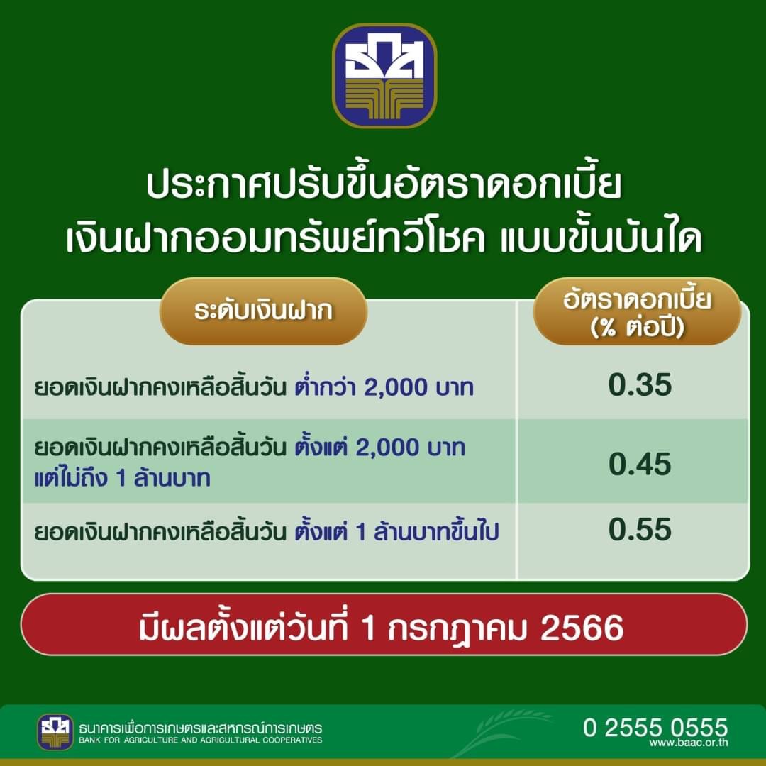 และเพื่อเพิ่มผลตอบแทนให้กับผู้ฝากและสนับสนุนการออมเงินอย่างต่อเนื่อง ธ.ก.ส. จึงประกาศปรับขึ้นอัตราดอกเบี้ยในโครงการเงินฝากออมทรัพย์ทวีโชค ร้อยละ 0.10 ต่อปี ทุกระดับเงินฝาก ดังนี้ ระดับเงินฝากคงเหลือ ต่ำกว่า 2,000 บาท อัตราดอกเบี้ยปรับขึ้นจากร้อยละ 0.25 เป็นร้อยละ 0.35 ต่อปี ระดับเงินฝากคงเหลือ ตั้งแต่ 2,000 บาทแต่ไม่ถึง 1,000,000 บาท อัตราดอกเบี้ยปรับขึ้นจากร้อยละ 0.35 เป็นร้อยละ 0.45 ต่อปี และระดับเงินฝากคงเหลือ ตั้งแต่ 1,000,000 บาทขึ้นไป อัตราดอกเบี้ยปรับขึ้นจากร้อยละ 0.45 เป็นร้อยละ 0.55 ต่อปี โดยมีผลตั้งแต่วันที่ 1 กรกฎาคม 2566 เป็นต้นไป ซึ่งธนาคารจะจ่ายดอกเบี้ยปีละ 2 ครั้ง ในเดือนมีนาคมและเดือนกันยายนของทุกปี โดยโอนเข้าบัญชีเงินฝากออมทรัพย์ทวีโชคโดยตรง ซึ่งบุคคลธรรมดาได้รับการยกเว้นภาษีดอกเบี้ยเงินฝาก