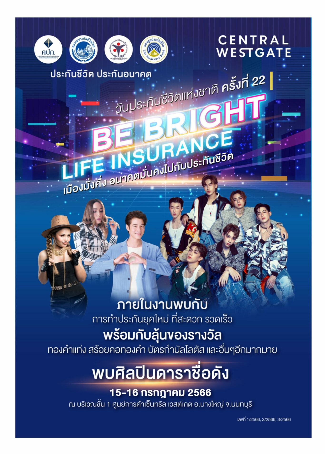 วันประกันชีวิตแห่งชาติ ครั้งที่ 22 ภายใต้แนวคิด Be Bright Life Insurance เมืองมั่งคั่ง อนาคตมั่นคงไปกับประกันชีวิต จัดขึ้นระหว่างวันที่ 15 – 16 กรกฎาคม 2566 บริเวณชั้น 1 โซน A B และC ศูนย์การค้าเซ็นทรัล เวสต์เกต จ.นนทบุรี