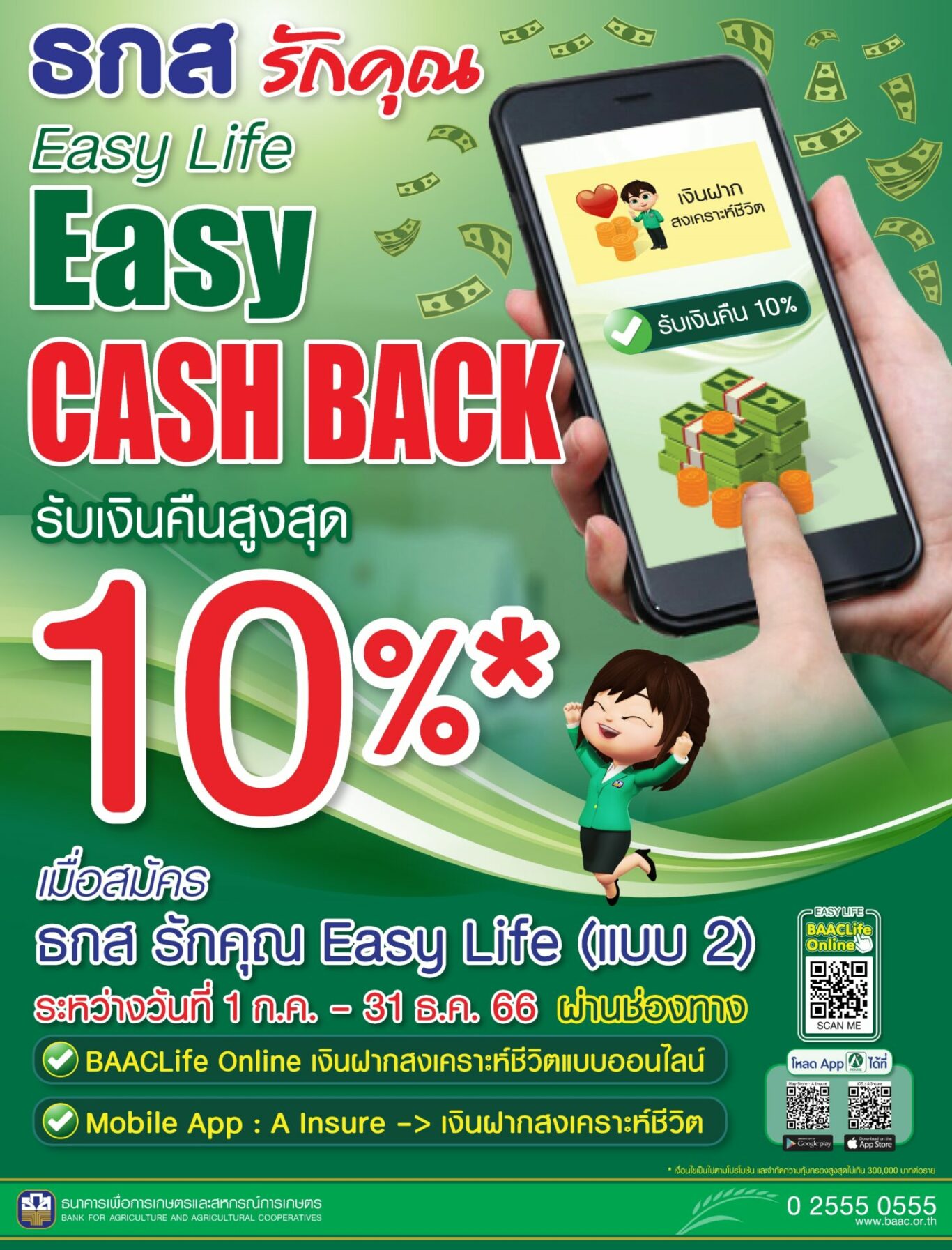 พิเศษ!! ตั้งแต่วันนี้จนถึงวันที่ 31 ธันวาคม 2566 เมื่อสมัคร “ธกส รักคุณ Easy Life แบบ 2” ได้ง่าย ๆ ทุกที่ ทุกเวลา ผ่านแอปพลิเคชั่น A Insure หรือ BAACLife Online ที่ www.baac.or.th รับความคุ้มครองดี ๆ จาก ธ.ก.ส. พร้อมรับ Cash Back สูงสุด 10% (โดยจะได้รับเงินคืนผ่านบัญชีออมทรัพย์ ธ.ก.ส. ภายใน 30 วัน หลังจากการชำระเงิน) ทั้งนี้ เงื่อนไขความคุ้มครองและการรับเงิน Cash Back เป็นไปตามที่ธนาคารกำหนด