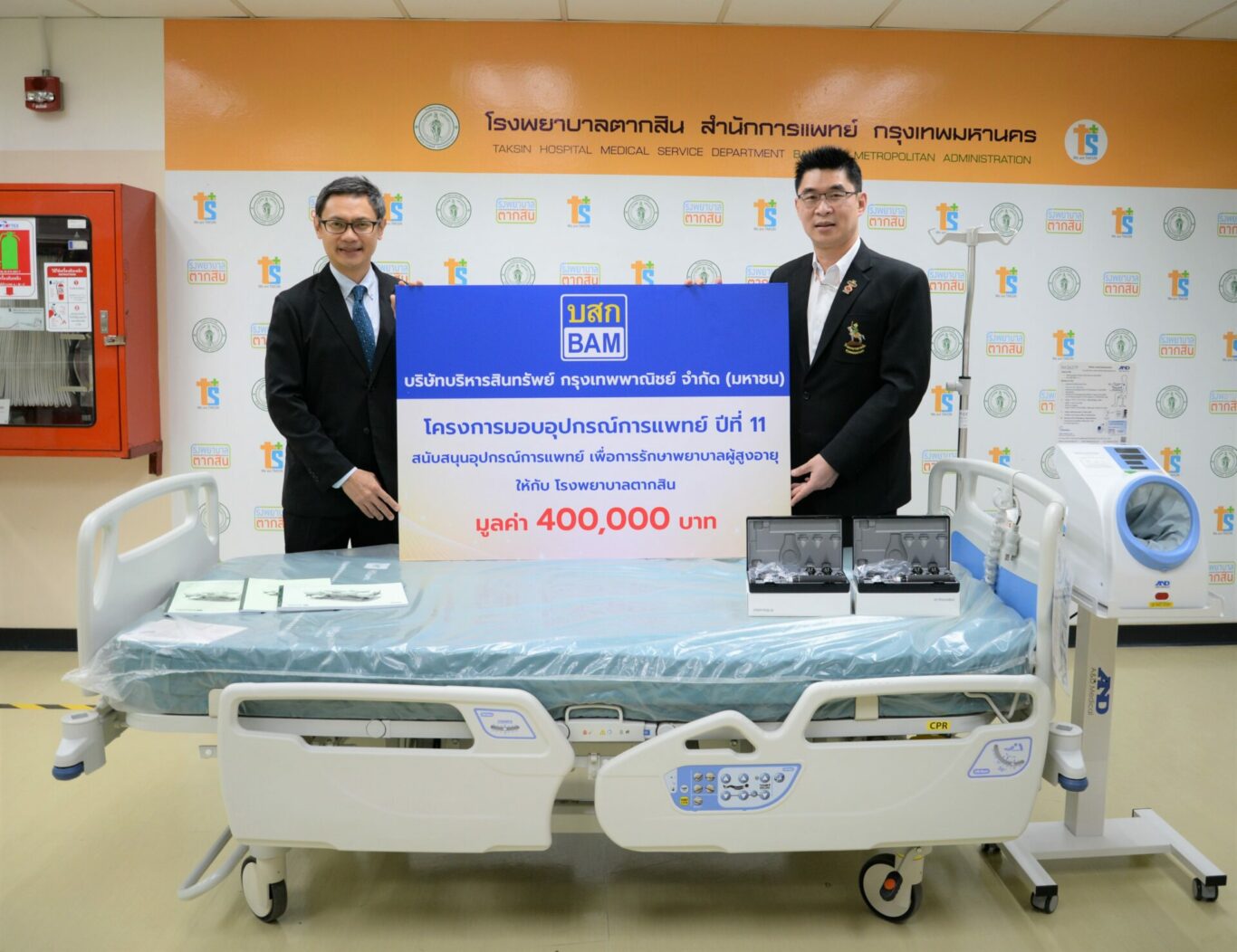 นายวีรเวช ศิริชาติไชย รองประธานเจ้าหน้าที่บริหาร พร้อมผู้บริหารบริษัทบริหารสินทรัพย์ กรุงเทพพาณิชย์ จำกัด (มหาชน) หรือ BAM มอบเตียงผู้ป่วยวิกฤตระบบไฟฟ้าพร้อมระบบชั่งน้ำหนักและรองรับการทำเอกซเรย์ รวมทั้งเครื่องวัดความดันโลหิตแบบอัตโนมัติ และชุดตรวจตา หู แบบหัตถการ คอ จมูก เพื่อการรักษาพยาบาลผู้สูงอายุรวมมูลค่า 400,000 บาท ให้กับโรงพยาบาลตากสิน กรุงเทพฯ โดยมี นายแพทย์ขจร อินทรบุหรั่น ผู้อำนวยการโรงพยาบาล เป็นผู้รับมอบ เพื่อใช้รักษาพยาบาลผู้สูงอายุวิกฤต ห้องอุบัติเหตุฉุกเฉิน เพิ่มประสิทธิภาพการติดตามดูแลผู้ป่วยได้อย่างใกล้ชิด