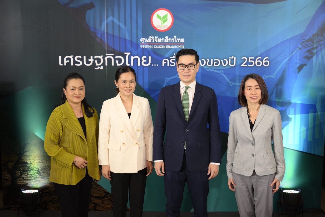 นายบุรินทร์ อดุลวัฒนะ (ที่ 2 จากขวา) กรรมการผู้จัดการ พร้อมคณะผู้บริหาร บริษัท ศูนย์วิจัยกสิกรไทย จำกัด แถลงทิศทางเศรษฐกิจครึ่งหลังของปี 2566 คงประมาณการจีดีพีปี 2566 ที่ 3.7% และคงตัวเลขการส่งออกไว้ที่-1.2% แต่ปรับลดการบริโภคภาครัฐบาลและการลงทุน รอการจัดตั้งรัฐบาลใหม่ ขณะที่ ห่วงภัยแล้งที่มีโอกาสรุนแรงกว่าคาด และหนี้ครัวเรือนที่ยังมีหนี้ก้อนยากรออยู่ ณ ธนาคารกสิกรไทย อาคารพหลโยธิน เมื่อเร็ว ๆ นี้