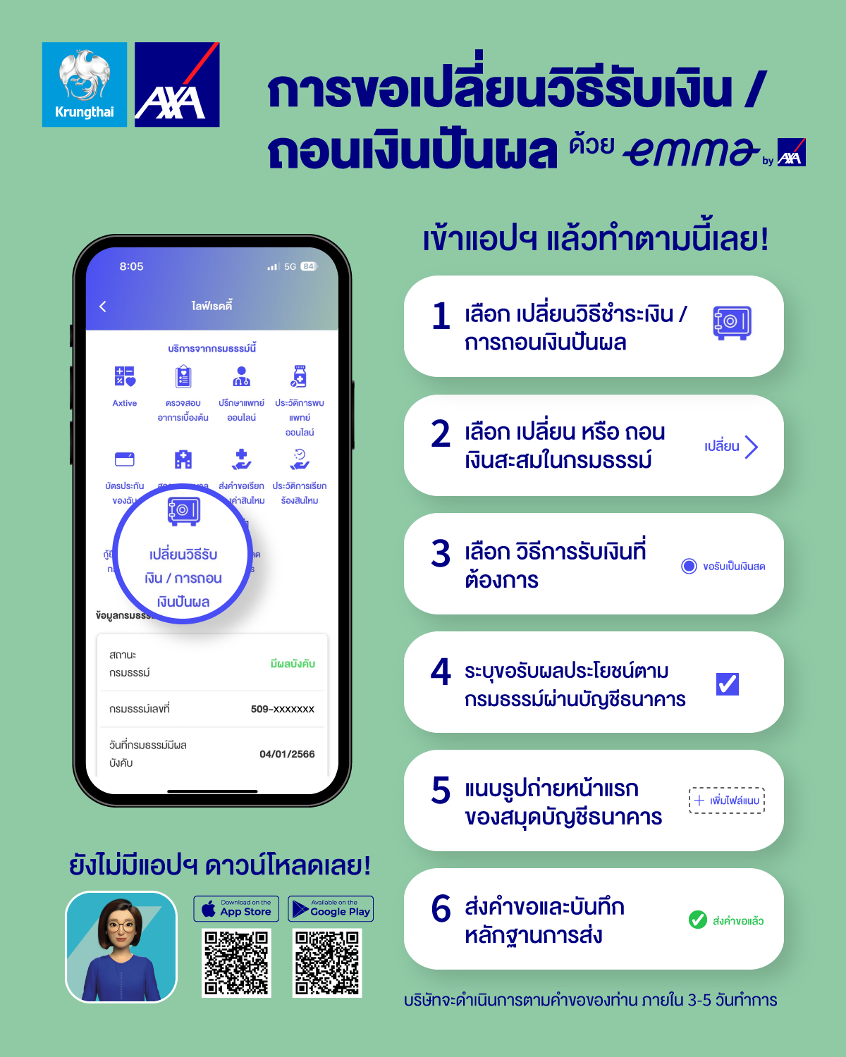 บมจ.กรุงไทย-แอกซ่า ประกันชีวิต ตอกย้ำการเป็นผู้นำด้านดิจิทัล พัฒนาฟีเจอร์ใหม่ให้สอดคล้องตามความต้องการของลูกค้า และอำนวยความสะดวกสูงสุดให้กับของลูกค้าคนสำคัญ ผู้ถือกรมธรรม์ประกันชีวิต (ชนิดมีเงินปันผล) สามารถส่งคำขอ เพื่อเลือกวิธีรับเงิน และการถอนเงินปันผลได้ด้วยตัวเองผ่านแอปพลิเคชัน Emma by AXA เพียงเลือกไอคอน “เปลี่ยนวิธีรับเงิน / การถอนเงินปันผล”