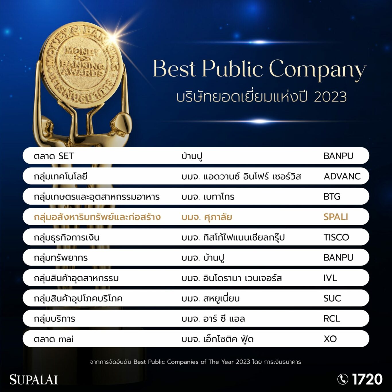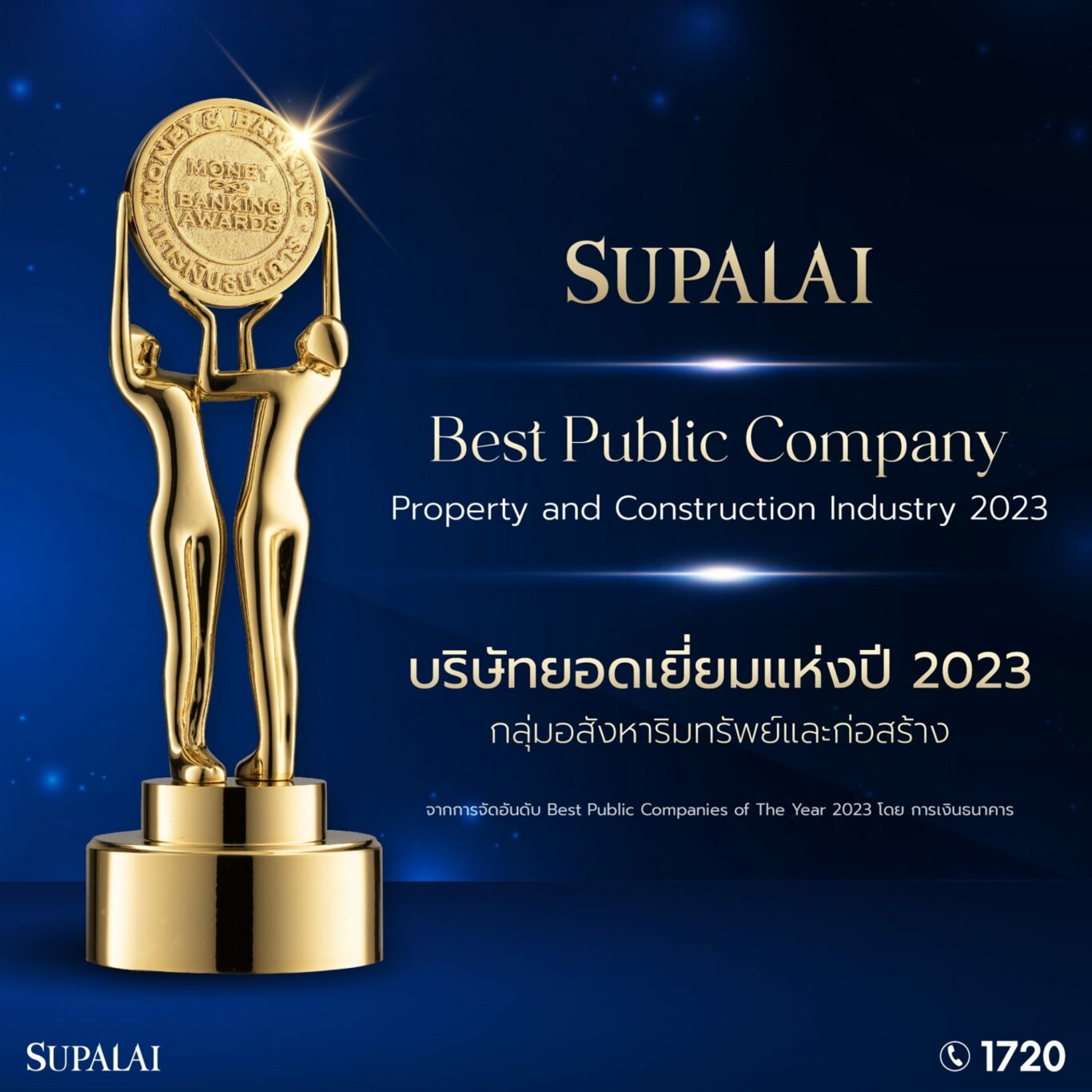 บริษัท ศุภาลัย จำกัด (มหาชน) คว้ารางวัลเกียรติยศ บริษัทยอดเยี่ยมแห่งปี 2566 กลุ่มอสังหาริมทรัพย์และก่อสร้าง Best Public Company – Property and Construction Industry 2023 จากการจัดอันดับ Best Public Companies of The Year 2023 โดย การเงินธนาคาร โดยมีผู้บริหารของบริษัทฯ นายไตรเตชะ ตั้งมติธรรม กรรมการผู้จัดการ และ นางศิริพร วังศพ่าห์ ผู้ช่วยกรรมการผู้จัดการ สายงานบัญชีและการเงิน รับมอบรางวัลอันทรงเกียรติดังกล่าว ที่มีผลการจัดอันดับเป็นที่ 1 ในกลุ่มอุตสาหกรรมอสังหาริมทรัพย์และก่อสร้าง