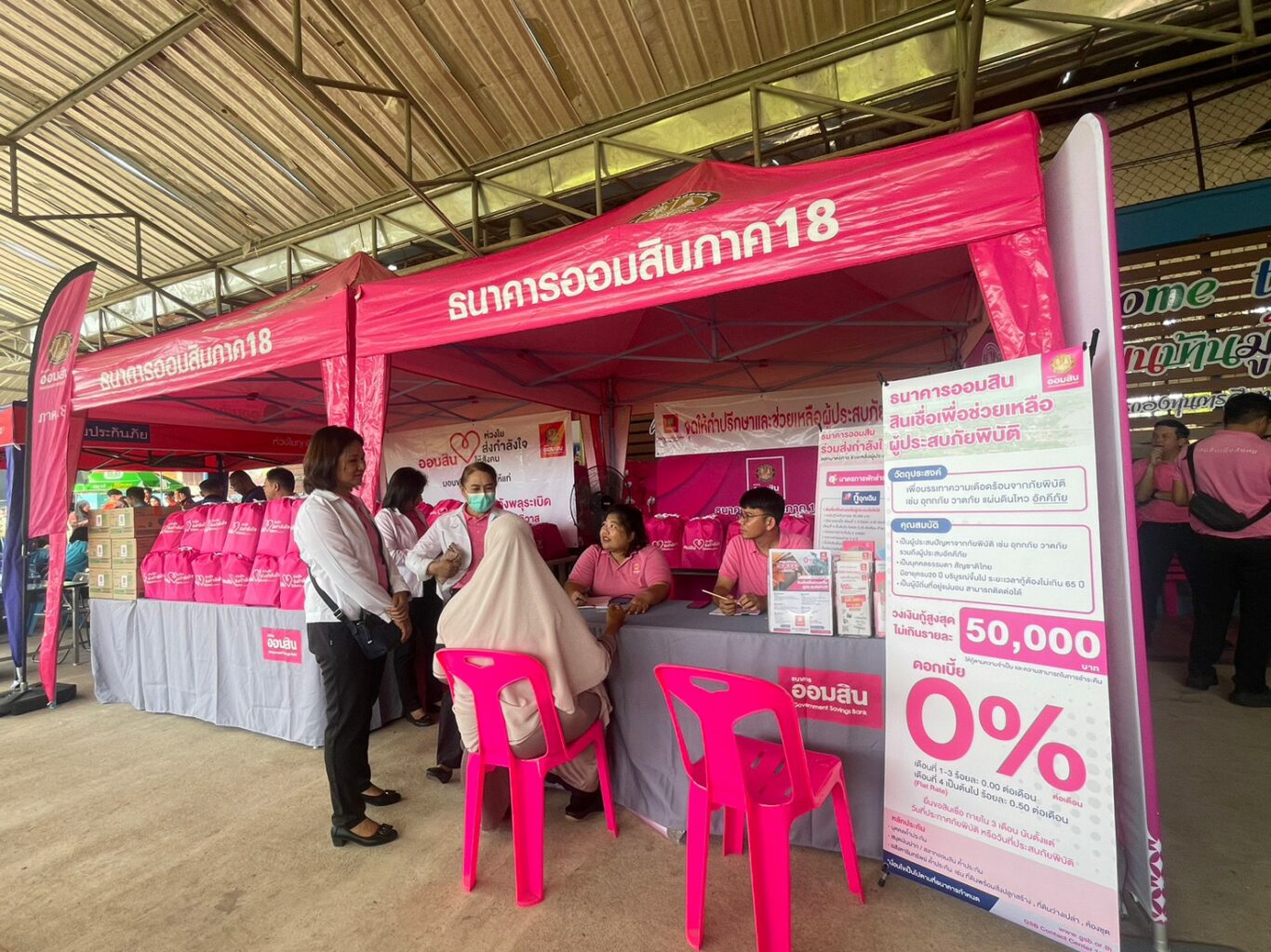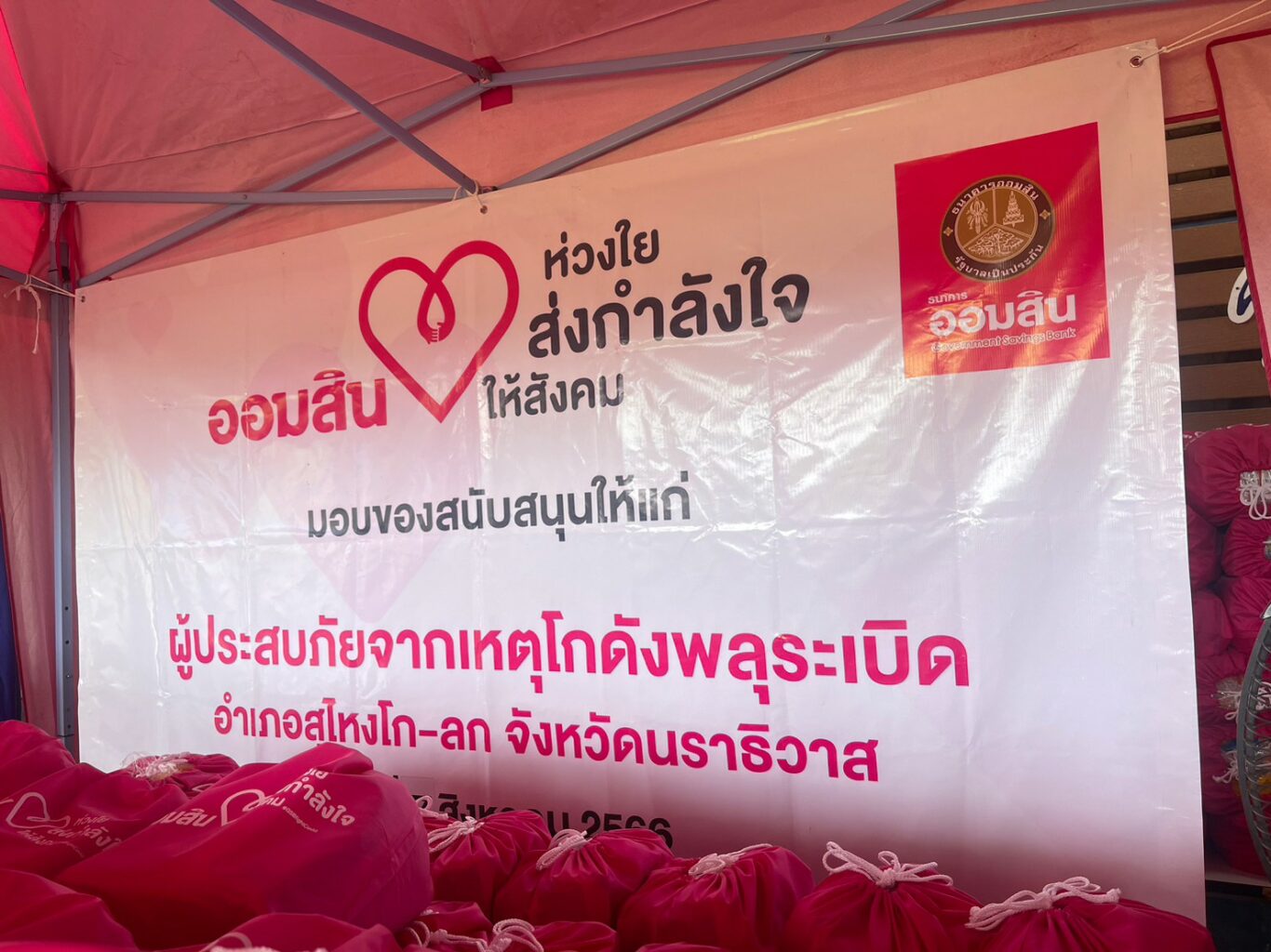 โดยธนาคารฯ ได้ตั้งจุดให้คำปรึกษาและช่วยเหลือผู้ประสบภัย พร้อมออกมาตรการช่วยเหลือเพิ่มเติม ได้แก่ มาตรการพักชำระหนี้ สินเชื่อเพื่อช่วยเหลือผู้ประสบภัยพิบัติ รายละไม่เกิน 50,000 บาท ดอกเบี้ย 0% เป็นระยะเวลา 3 เดือน สินเชื่อเคหะแก่ผู้ประสบภัยพิบัติ เพิ่มเติมสำหรับลูกค้าเดิมและประชาชนทั่วไปที่ได้รับผลกระทบเพื่อซ่อมแซมต่อเติมที่อยู่อาศัยส่วนที่เสียหายได้ถึง 100% ของราคาประเมิน สินเชื่อบุคคลแก่ผู้ประสบภัยพิบัติ เพื่อเป็นค่าใช้จ่ายอเนกประสงค์ วงเงินกู้สูงสุดไม่เกินรายละ 500,000 บาท และสินเชื่อเพื่อบรรเทาความเดือดร้อนแก่ลูกค้าสินเชื่อธุรกิจของธนาคาร วงเงินกู้สูงสุด 10% ของวงเงินกู้เดิม แต่ไม่เกิน 5 ล้านบาท ผ่อนนานสูงสุด 5 ปี โดยปลอดชำระเงินต้น 1 ปี เป็นต้น ณ โรงเรียนบ้านมูโนะ จังหวัดนราธิวาส เมื่อวันที่ 7 สิงหาคม 2566