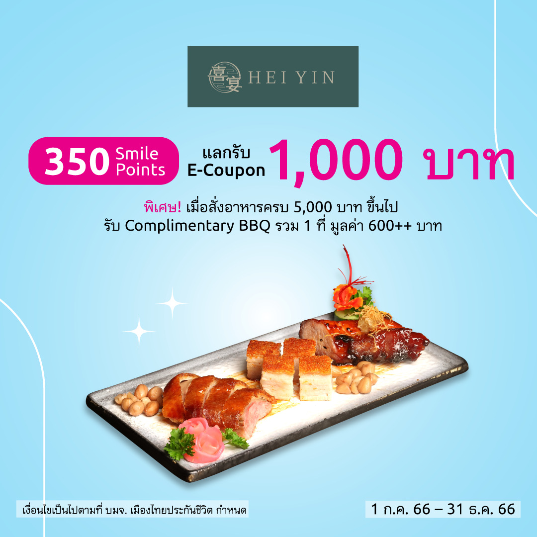 • ร้านอาหารจีนเฮยยิน HEI YIN ร้านอาหารจีนสไตล์กวางตุ้งขนานแท้ ที่ได้รับการดูแลอย่างพิถีพิถันโดยเชฟใหญ่สัญชาติฮ่องกง ใช้ 350 Smile Points แลกรับ E-Voucher แทนส่วนลดมูลค่า 1,000 บาท พิเศษ! เมื่อสั่งอาหารครบ 5,000 บาท ขึ้นไป รับ Complimentary BBQ รวม 1 ที่ มูลค่า 600++ บาท (กำหนด 1 สิทธิ์ / 1 โต๊ะ) โดยสมาชิกฯ สามารถรับสิทธิ์และใช้สิทธิ์เข้ารับบริการร้านอาหารได้ตั้งแต่วันนี้ถึงวันที่ 31 ธันวาคม 2566