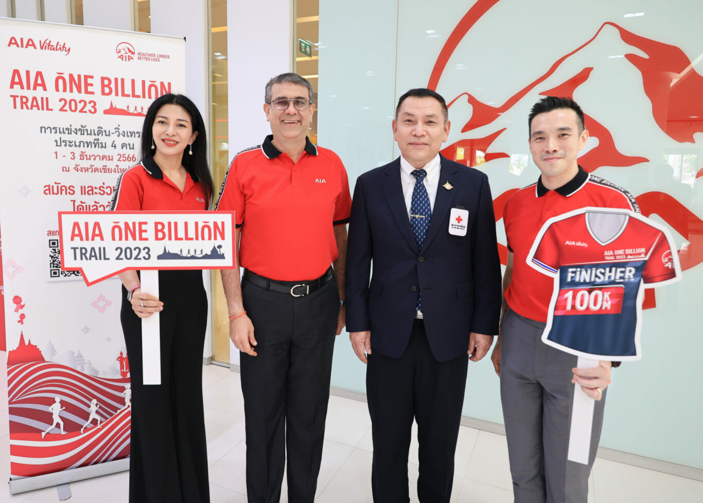 กรุงเทพฯ 9 สิงหาคม 2566 – เอไอเอ ประเทศไทย นำโดย นายนิคฮิล แอดวานี ประธานเจ้าหน้าที่บริหาร นายณัฐพิสิษฐ์ ครุฑครองชัย ประธานเจ้าหน้าที่ฝ่ายตัวแทนประกันชีวิต และ นางสาวรพีพร วงศ์ทองคำ ผู้อำนวยการฝ่ายสื่อสารองค์กรและภาพลักษณ์ พร้อมด้วย นายวิทยา จันทร์ฉลอง ผู้ช่วยผู้อำนวยการสำนักงาน บริหารกิจการเหล่ากาชาด ร่วมเปิดตัวโครงการ AIA One Billion Trail 2023 การแข่งขันเดิน – วิ่งเทรล ประเภททีม 4 คน ซึ่งจัดขึ้นต่อเนื่องเป็นปีที่ 2 โดยมีวัตถุประสงค์เพื่อระดมทุนบริจาคให้แก่สภากาชาดไทย ในการนำไปสนับสนุนโครงการส่งเสริมและพัฒนาการพูด อ่าน เขียน ภาษาไทย เพื่อช่วยเหลือเด็กนักเรียนในถิ่นทุรกันดาร ถือเป็นการสานต่อปณิธานในการร่วมพัฒนาศักยภาพเด็กไทย ให้เข้าถึงการศึกษาขั้นพื้นฐาน ซึ่งปีที่ผ่านมา มีนักวิ่งเทรลเข้าร่วมงานกว่า 400 ทีม หรือกว่า 1,600 คนจากทั่วประเทศ สำหรับการแข่งขัน AIA One Billion Trail 2023 จะจัดขึ้นระหว่างวันที่ 1-3 ธันวาคม 2566 ณ จังหวัดเชียงใหม่ โดยเป็นการแข่งขันประเภททีม ทีมละ 4 คน มีระยะทางให้นักวิ่งได้เลือกลงแข่งทั้งสิ้น 4 ระยะทาง ได้แก่ 100, 50, 25 และ 10 กิโลเมตร
