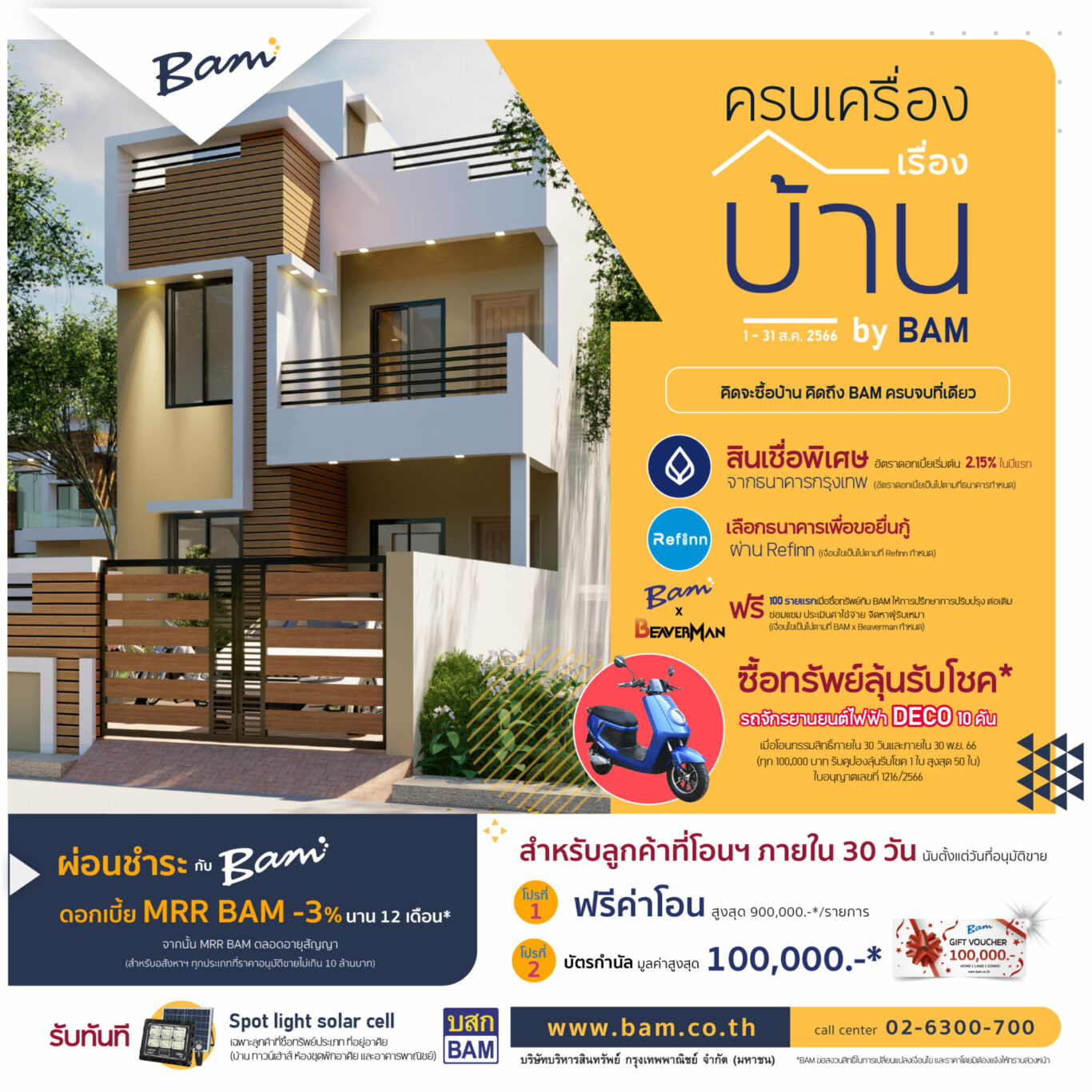 BAM คัดที่อยู่อาศัยพร้อมอยู่ทั่วประเทศกว่า 10,000 รายการ ให้ลูกค้าเลือกช็อปตั้งแต่วันนี้ ถึงวันที่ 31 สิงหาคม 2566 ลูกค้าซื้อทรัพย์รับทันที Spot light solar cell พร้อมรับโปร “โอนเร็ว รับเลย” ฟรีค่าโอนสูงสุด 900,000 บาทต่อรายการทรัพย์ และบัตรกำนัลมูลค่าสูงสุด 100,000 บาท ลูกค้าซื้อทรัพย์อัตราดอกเบี้ยพิเศษจากธนาคารกรุงเทพ หรือเลือกธนาคารยื่นขอสินเชื่อพิเศษออนไลน์ พร้อมฟรีให้คำปรึกษา ปรับปรุง ต่อเติม ซ่อมแซม ประเมินค่าใช้จ่าย จัดหาผู้รับเหมา และร่วมลุ้นรับจักรยานยนต์ไฟฟ้า