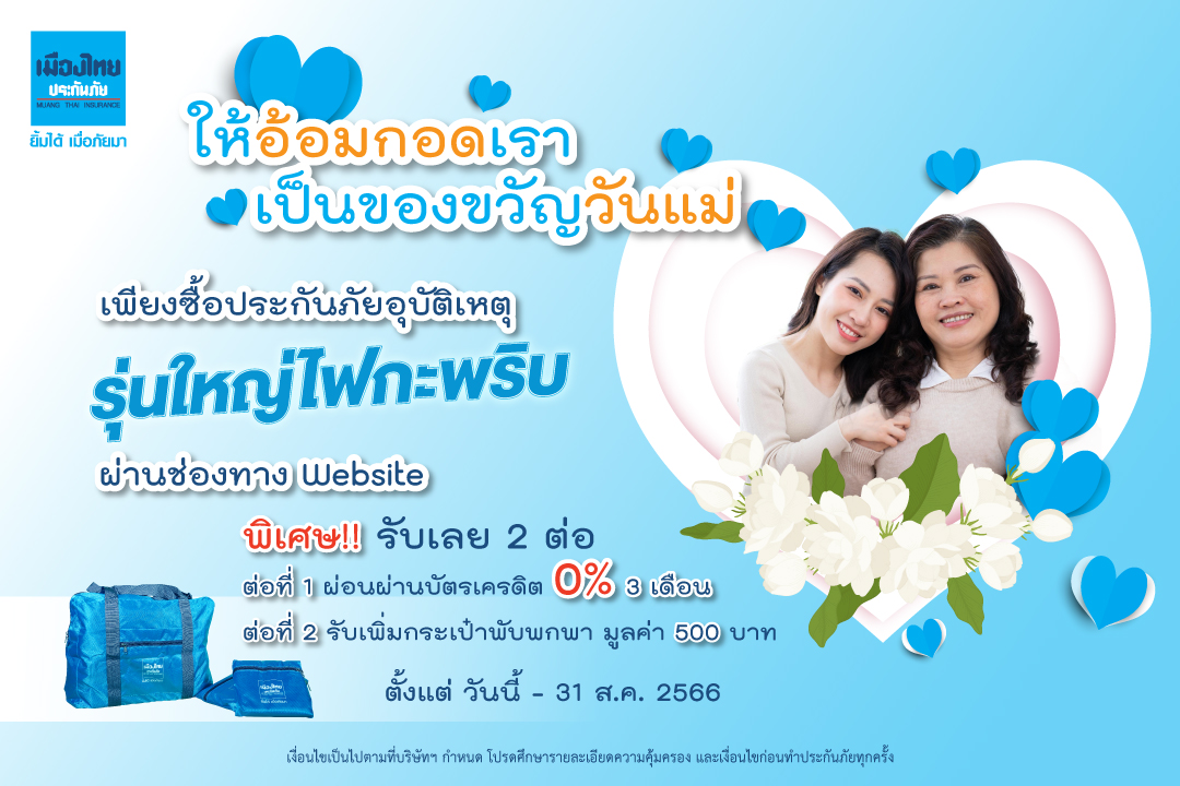 • พิเศษ สำหรับช่วงเดือนของวันแม่ รับเพิ่มกระเป๋าพับพกพา มูลค่า 500 บาท สามารถอ่านรายละเอียดโปรโมชันเพิ่มเติมได้ที่ page Facebook เมืองไทยประกันภัย Muang Thai Insurance – MTI