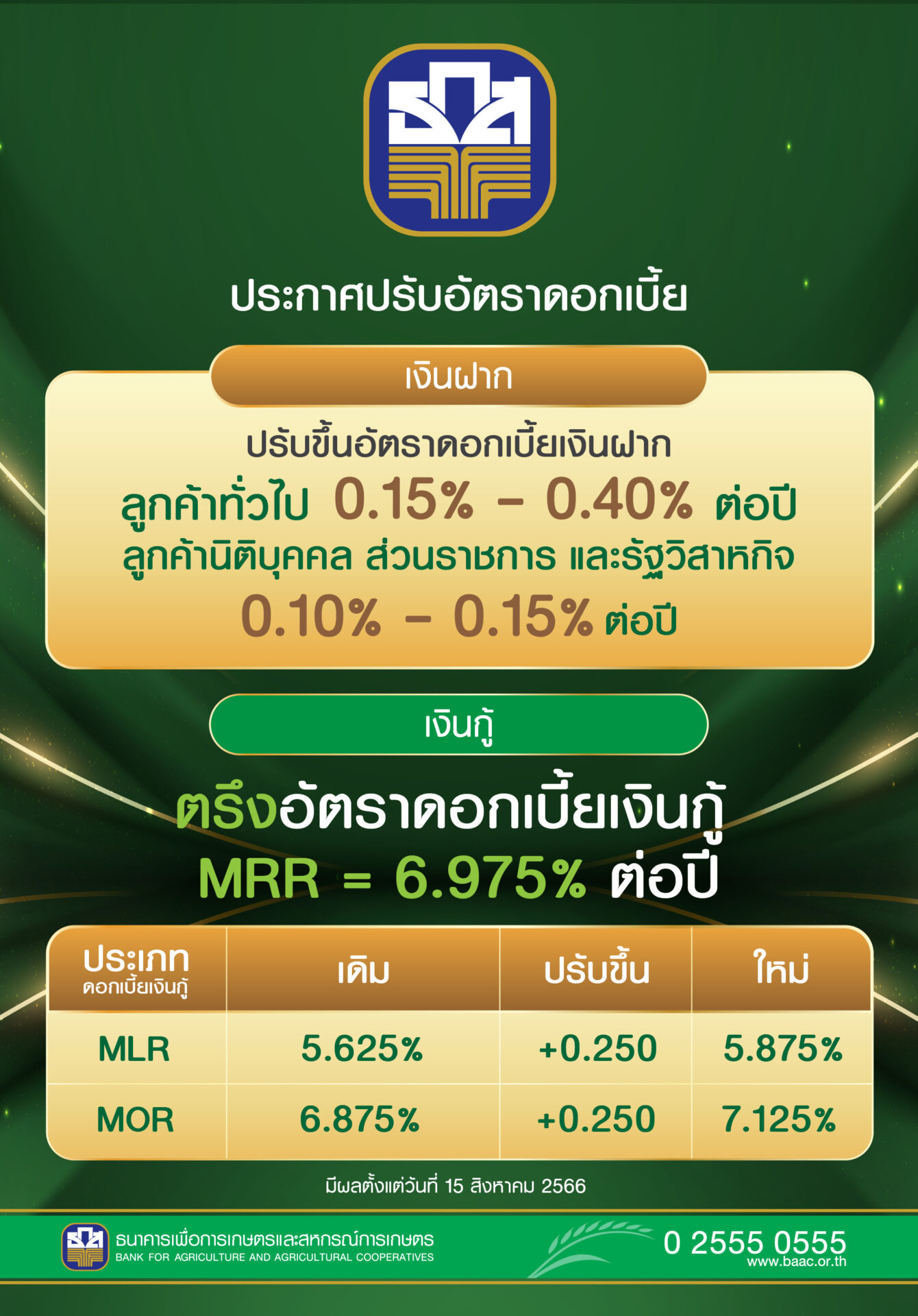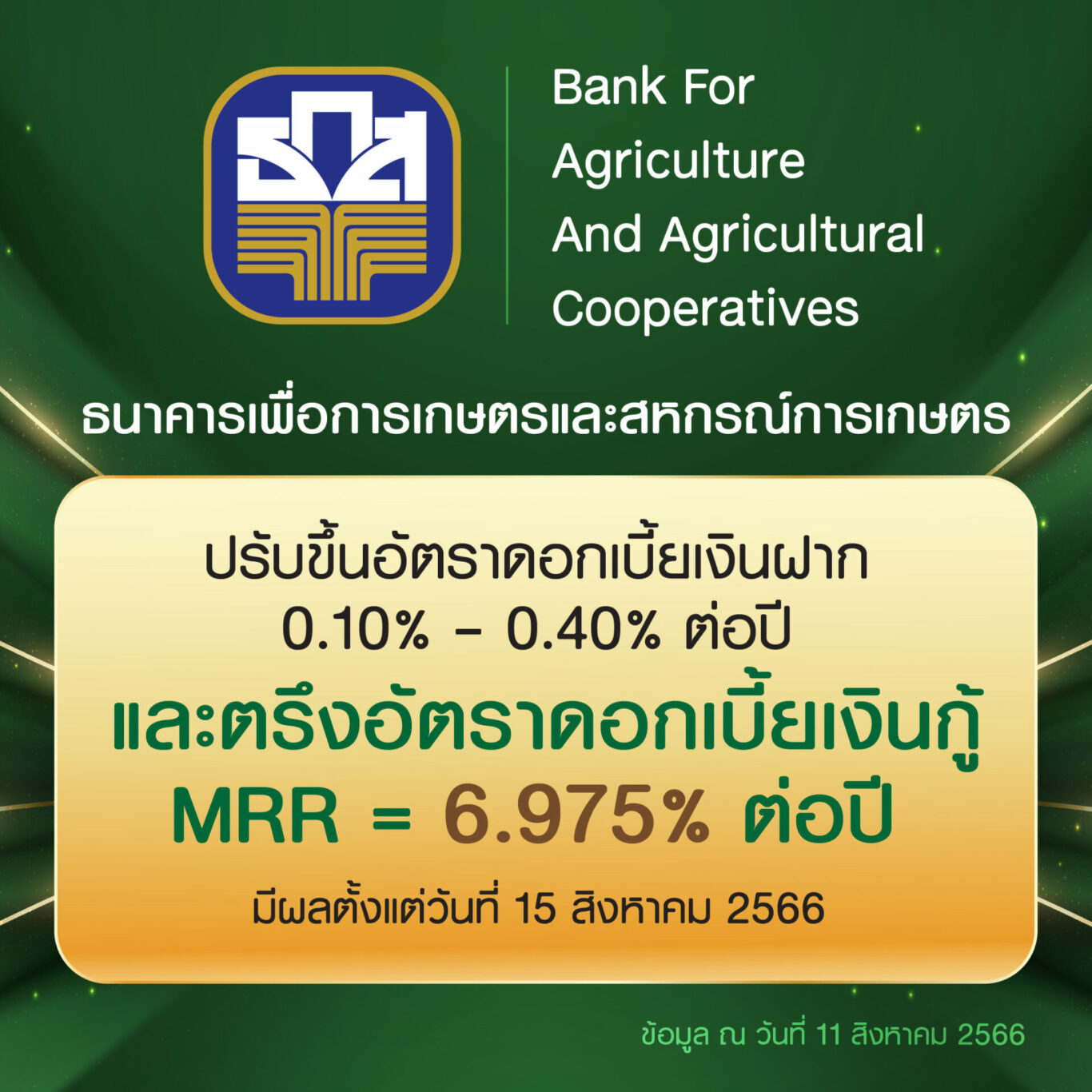 ธ.ก.ส. ประกาศปรับขึ้นอัตราดอกเบี้ยเงินฝากประจำ สูงสุดร้อยละ 0.40 ต่อปี และปรับอัตราดอกเบี้ยเงินกู้ MLR และ MOR ร้อยละ 0.25 ต่อปี โดยมีผลตั้งแต่ 15 ส.ค. 66 เป็นต้นไป เพื่อให้สอดคล้องกับทิศทางอัตราดอกเบี้ยในตลาดที่ปรับขึ้นตามอัตราดอกเบี้ยนโยบาย แต่ยังตรึงอัตราดอกเบี้ย MRR สำหรับเกษตรกรรายย่อย เพื่อลดภาระและสนับสนุนการฟื้นตัวตามภาวะเศรษฐกิจ พร้อมวางแนวทางในการดูแลลูกค้าผ่านการบริหารจัดการหนี้ การให้คำปรึกษาทั้งหนี้ในและนอกระบบผ่านโครงการ มีหนี้นอกบอก ธ.ก.ส. ควบคู่กับการเติมสินเชื่อใหม่ในอัตราดอกเบี้ยผ่อนปรน เพื่อเป็นค่าใช้จ่ายหมุนเวียนและเสริมสภาพคล่อง ในการลงทุน