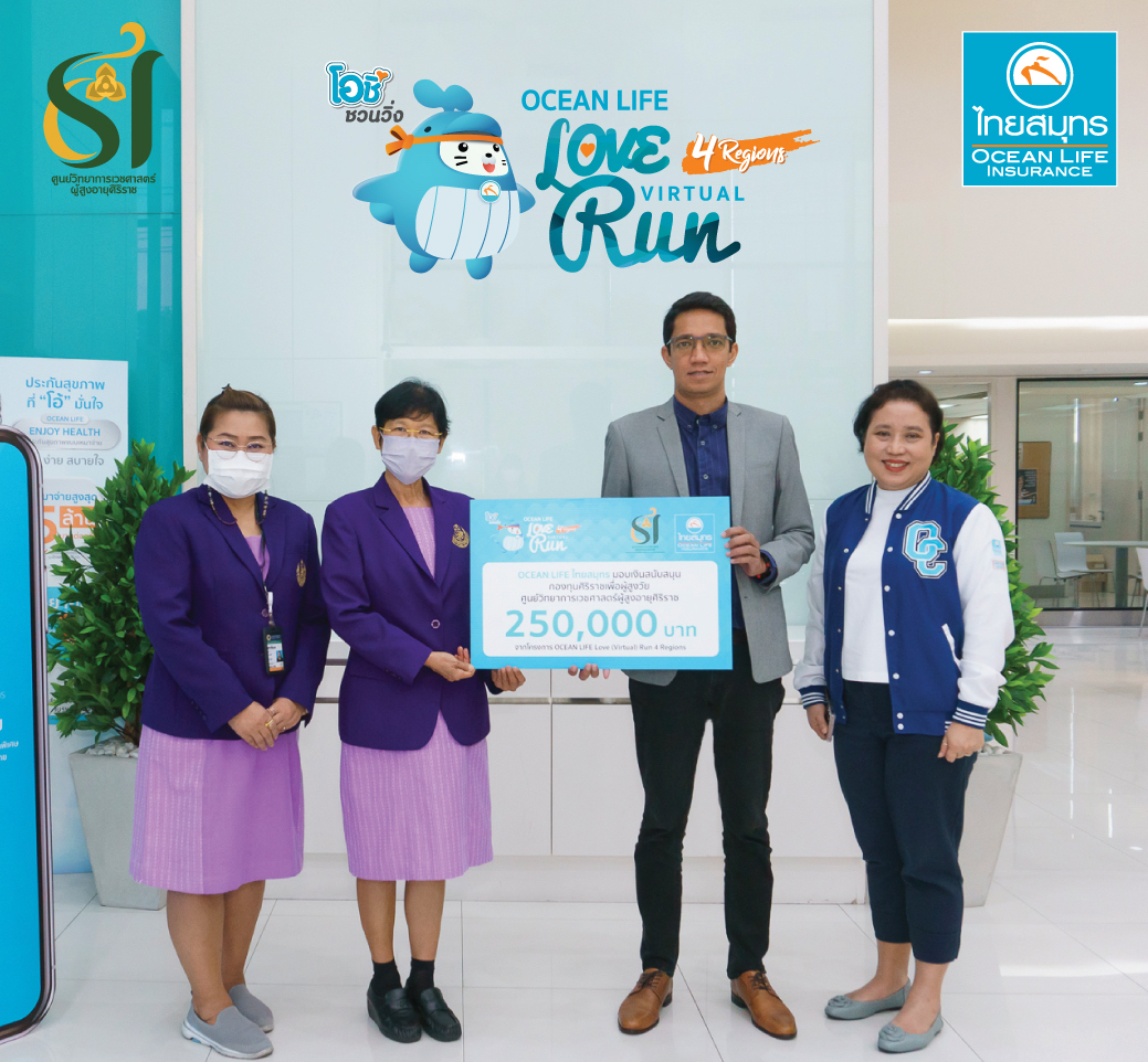 บมจ.ไทยสมุทรประกันชีวิต รักคือพลังของชีวิต โดย นายระวิน มุคขจี Vice President Customer Experience Management ตระหนักดีว่าสังคมไทยได้ก้าวสู่สังคมผู้สูงอายุโดยสมบูรณ์ (Aged Society) ดังนั้น เราจึงได้ให้ความสำคัญต่อการดูแลและสร้างเสริมสุขภาวะที่ดีให้กับผู้สูงอายุ เพื่อความสุขที่ยั่งยืน โดยได้ร่วมสนับสนุนเงินจากกิจกรรม OCEAN LIFE LOVE (Virtual) RUN 4 Regions ภาคกลาง จำนวนเงินทั้งสิ้น 250,000 บาท มอบให้แก่ “กองทุนศิริราชเพื่อผู้สูงวัย” เพื่อสร้าง “ศูนย์วิทยาการเวชศาสตร์ผู้สูงอายุศิริราช” ดำเนินงานโดยคณะแพทย์ศาสตร์ศิริราชพยาบาล เพื่อเป็นต้นแบบของประเทศ ในการดูแลผู้ป่วยสูงอายุหลังพ้นการเจ็บป่วยในระยะเฉียบพลัน ให้เตรียมตัวกลับไปใช้ชีวิตต่อที่บ้านได้ และยังเป็นแหล่งเผยแพร่ความรู้ให้กับโรงพยาบาลต่าง ๆ และสังคมต่อไป