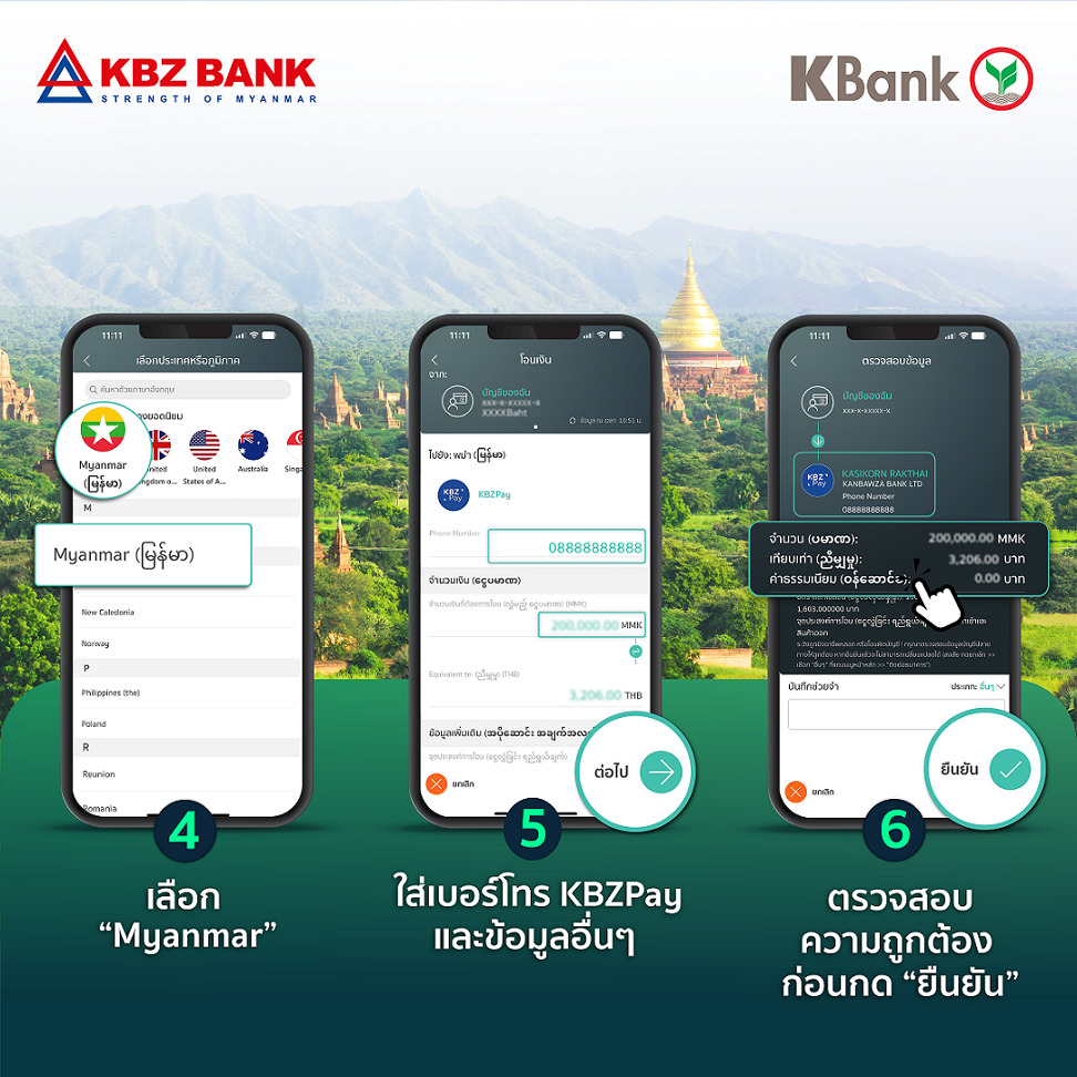 นาย U Zaw Lin Aung ประธานเจ้าหน้าที่บริหาร KBZ Bank กล่าวว่า “รู้สึกยินดีเป็นอย่างยิ่งที่ได้ร่วมงานกับธนาคารกสิกรไทยในโปรเจคครั้งสำคัญนี้ ซึ่งจะช่วยให้ชาวเมียนมาทั้งในประเทศและต่างประเทศ เข้าถึงบริการทางการเงินได้มากขึ้น ด้วยความร่วมมือนี้ ลูกค้าชาวเมียนมาในประเทศไทยจะสามารถโอนเงินกลับบ้านให้ครอบครัวและคนสำคัญได้ทันที โดยจะได้รับเงินเข้าบัญชี KBZPay e-Wallets แบบเรียลไทม์ และด้วยบริการนี้ ลูกค้าไม่จำเป็นเดินทางและไปรอคิวที่สาขา รวมถึงไม่ต้องเตรียมเอกสารให้วุ่นวายอีกด้วย”