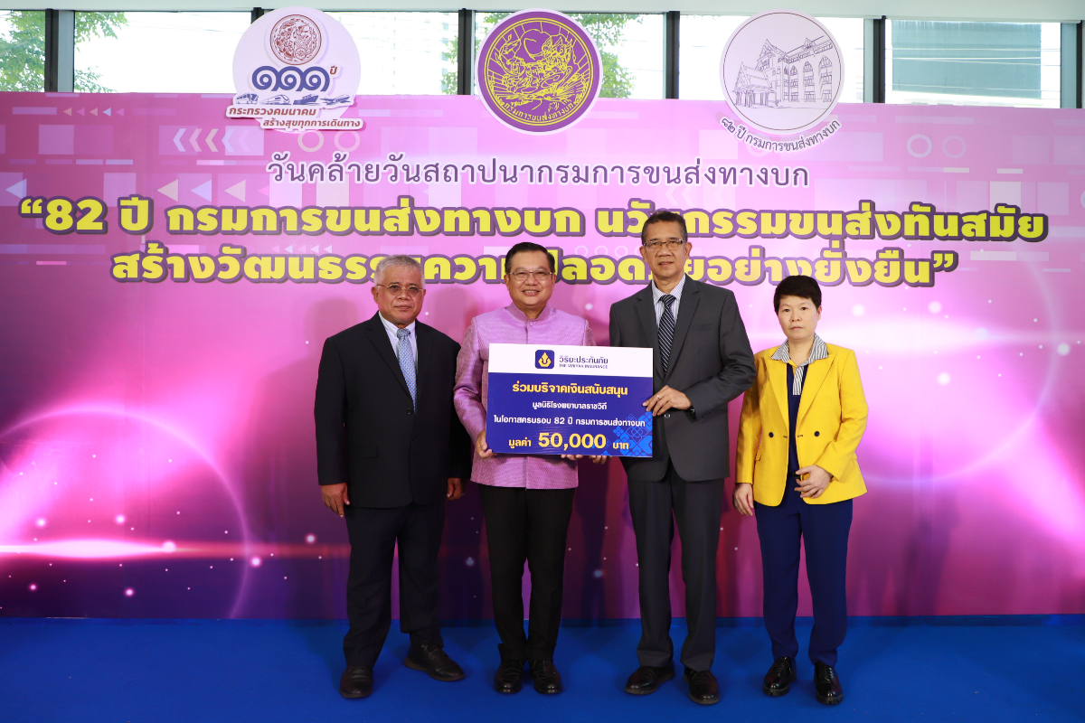 นายจิรุตม์ วิศาลจิตร อธิบดีกรมการขนส่งทางบก รับมอบเงินสนับสนุนมูลนิธิโรงพยาบาลราชวิถี จำนวน 50,000 บาท จาก บริษัท วิริยะประกันภัย จำกัด (มหาชน) โดยมี นายสุรพงษ์ กิจชิต ผู้จัดการฝ่ายปฏิบัติการภาค 6 (ภาคกรุงเทพฯ) ด้านสาขา เป็นผู้แทนบริษัทฯ มอบ เพื่อร่วมแสดงความยินดีและสมทบทุนองค์กรสาธารณกุศล เนื่องในโอกาสครบรอบ 82 ปี วันคล้ายวันสถาปนากรมการขนส่งทางบก ณ อาคารศูนย์นวัตกรรมและเทคโนโลยีการขนส่งทางถนน กรมการขนส่งทางบก เขตจตุจักร กรุงเทพฯ