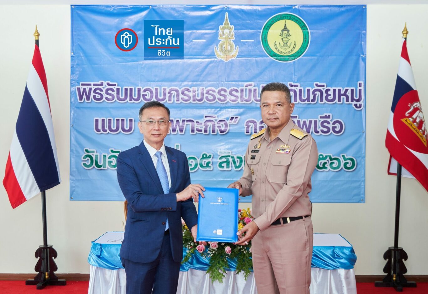 พลเรือตรี คมพันธ์ อุปลานนท์ เจ้ากรมสวัสดิการทหารเรือ รับมอบกรมธรรม์ประกันชีวิตหมู่แบบ “เฉพาะกิจ” จาก นายสวัสดิ์ นฤวรวงศ์ รองผู้จัดการใหญ่ บริษัท ไทยประกันชีวิต จำกัด (มหาชน) เพื่อให้ความคุ้มครองกำลังพลของกองทัพเรือที่ปฏิบัติหน้าที่ในพื้นที่ 3 จังหวัดชายแดนภาคใต้ หรือได้รับคําสั่งให้ไปปฏิบัติหน้าที่ในพื้นที่ 14 จังหวัดภาคใต้ หรือชายแดนภาคตะวันออก (จันทบุรีและตราด) สังกัดหน่วยปฏิบัติการทุ่นระเบิดด้านมนุษยธรรมกองทัพเรือ / หน่วยปฏิบัติการทุ่นระเบิดด้านมนุษยธรรมที่ 2 หรือผู้ที่ปฏิบัติหน้าที่อยู่ในหน่วยเฉพาะกิจกองทัพเรือตามพื้นที่ชายแดน และกำลังพลที่ได้รับคำสั่งให้ไปปฏิบัติภารกิจในเขตพื้นที่ดังกล่าว ณ กรมสวัสดิการทหารเรือ