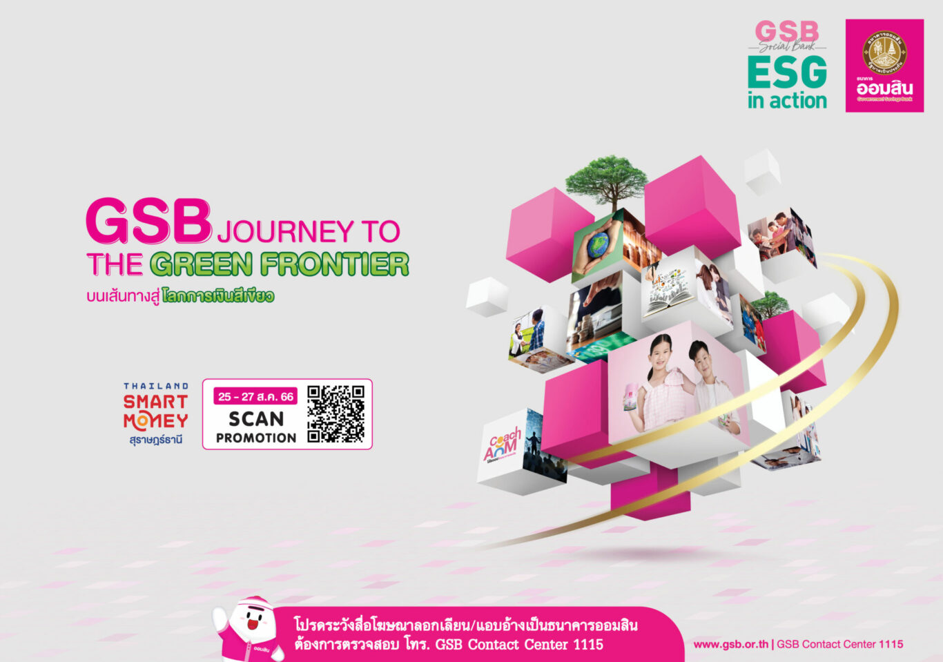 ธนาคารออมสิน เข้าร่วมงาน Thailand Smart Money สุราษฎร์ธานี ครั้งที่ 9 ระหว่างวันที่ 25-27 ส.ค. 2566 ณ เซ็นทรัล สุราษฎร์ธานี ภายใต้แนวคิด “GSB Journey to The Green Frontier : บนเส้นทางสู่โลกการเงินสีเขียว” สอดคล้องตามยุทธศาสตร์ธนาคารเพื่อสังคมที่มุ่งเน้นดำเนินการตามกรอบ ESG in action สู่การพัฒนาที่ยั่งยืน โดยให้ความสำคัญตั้งแต่กระบวนการจัดทำบูธที่เลือกใช้วัสดุที่เป็นมิตรต่อสิ่งแวดล้อม พร้อมนำเสนอโปรโมชันน่าสนใจในงานนี้ ทั้งผลิตภัณฑ์เงินฝากส่งเสริมการออมสำหรับทุกวัย สินเชื่อบุคคล เงินกู้บ้าน ที่เข้ากับกระแสรักษ์โลก แหล่งเงินทุน/เติมสภาพคล่อง สนับสนุนกิจการทุกกลุ่มลูกค้า