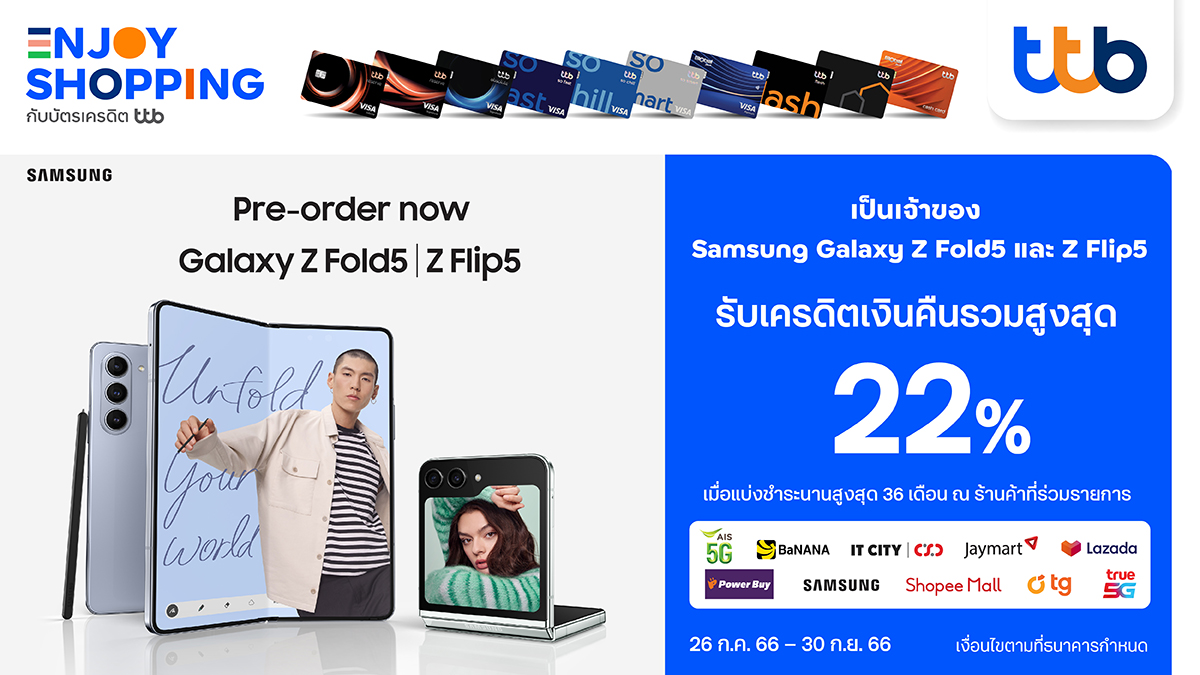 ทีเอ็มบีธนชาต หรือ ทีทีบี มอบสิทธิพิเศษสำหรับผู้ถือบัตรเครดิต และบัตรกดเงินสด ttb ด้วยโปรโมชันสุดคุ้มเมื่อซื้อ Samsung Galaxy Z Fold5 | Z Flip 5 และทำรายการแบ่งชำระ 0% นานสูงสุด 36 เดือน ที่ร้านค้าชั้นนำ ได้แก่ AIS, TRUE, BaNANA, Jaymart, TG Fone และ IT City & CSC หรือทางช่องทางออนไลน์ samsung.com, ShopeeMall และ Lazada ระหว่างวันที่ 26 กรกฎาคม 2566 – 30 กันยายน 2566