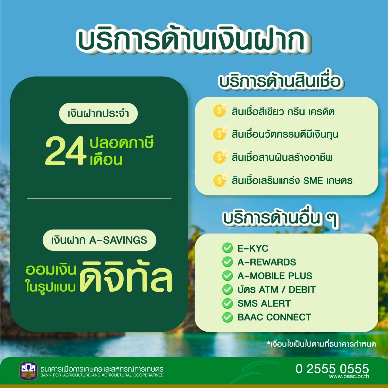ธ.ก.ส. จัดโปรโมชันเงินฝากพิเศษ ในแคมเปญ Exclusive 58 รับผลตอบแทนเงินฝากแบบขั้นบันได สูงสุด 15.80% ต่อปี แคมเปญ Step Up ฝากเงิน 10 เดือน รับดอกเบี้ยสูงสุดกว่า 6.20% ต่อปี แคมเปญฝากแสน แถมพันกับบัญชี A-Saving และร่วมลุ้นรางวัลกับสลากออมทรัพย์ ชุดมั่งมีทวีโชค ออม 100 ลุ้น 10 ล้าน พร้อมบริการสินเชื่ออัตราดอกเบี้ยพิเศษหนุนธุรกิจที่เป็นมิตรกับสิ่งแวดล้อม ทั้งสินเชื่อ BCG สินเชื่อแทนคุณ สินเชื่อเสริมแกร่ง SME เกษตร และการให้คำปรึกษาด้านการเงิน ชวนร่วมสนุกกับกิจกรรมภายในบูธ รับของที่ระลึกมากมาย และ ชอปสินค้าคุณภาพดีจากเกษตรกรและชุมชนมาตรฐาน A-Product ได้ที่บูธ ธ.ก.ส. ในงาน Thailand Smart Money สุราษฎร์ธานี ระหว่างวันที่ 25 – 27 สิงหาคมนี้ ณ ศูนย์การค้าเซ็นทรัล สุราษฎร์ธานี
