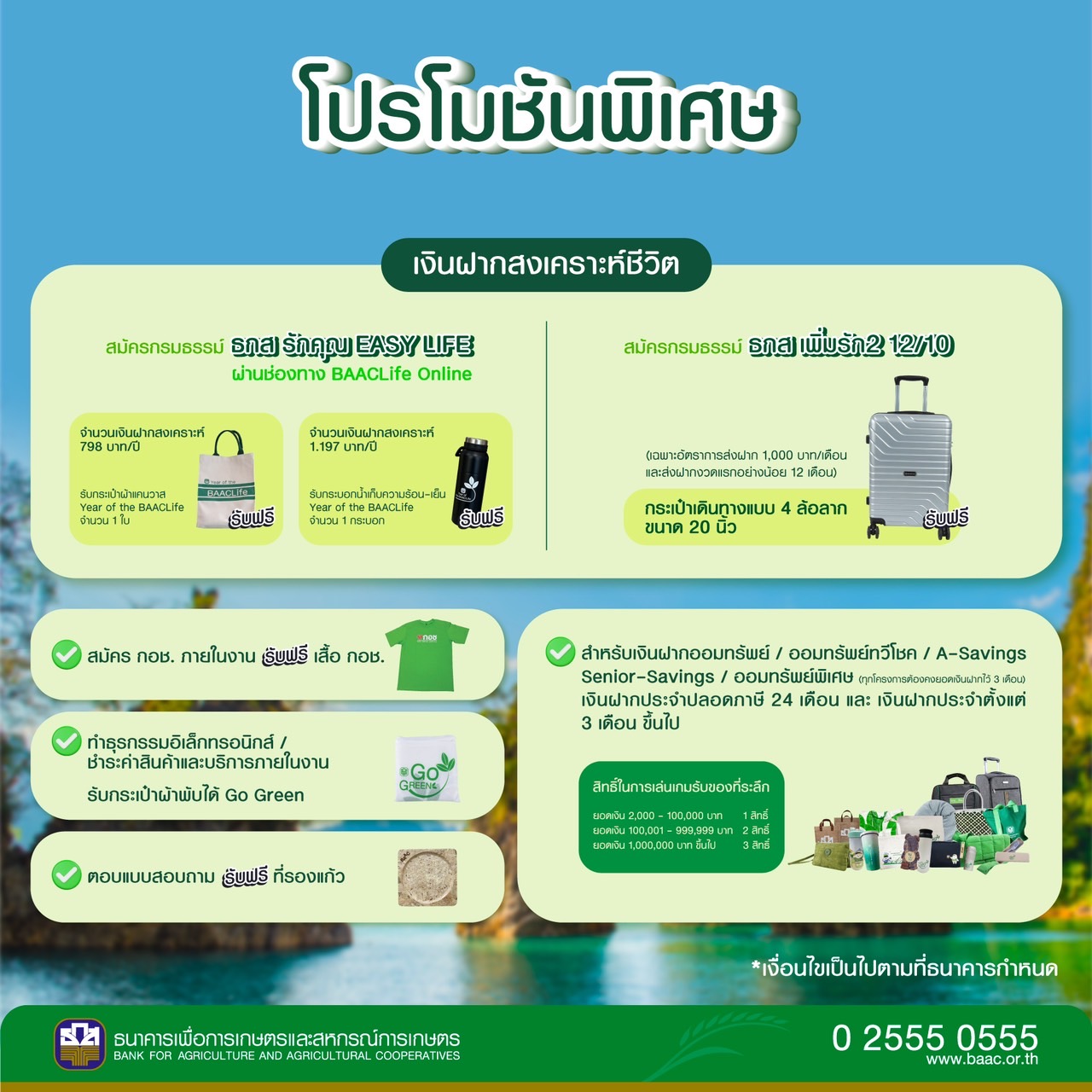 ด้านผลิตภัณฑ์เงินฝากสงเคราะห์ชีวิต ธ.ก.ส. มุ่งส่งเสริมการสร้างภูมิคุ้มกันทางการเงินและการออมแบบยั่งยืนด้วยเงินฝากสงเคราะห์ชีวิต พิเศษเฉพาะในงาน! เมื่อสมัครกรมธรรม์ ธกส เพิ่มรัก2 12/10 รับทันที กระเป๋าเดินทางล้อลากขนาด 20 นิ้ว หรือสมัครกรมธรรม์ ธกส รักคุณ Easy Life ผ่านแอปพลิเคชัน BAACLife Online รับกระเป๋าผ้าแคนวาส หรือกระบอกน้ำเก็บความร้อน – เย็น โดยลูกค้าที่สมัครกรมธรรม์เงินฝากสงเคราะห์ชีวิต ทุกประเภท ได้รับสิทธิลุ้นรับทองคำในแคมเปญปลูกรัก รับโชค น้ำหนักกว่า 90 บาท มูลค่ากว่า 2.9 ล้านบาท 1 สิทธิ์/กรมธรรม์ ระยะเวลาตั้งแต่วันนี้จนถึง 15 ตุลาคม 2566