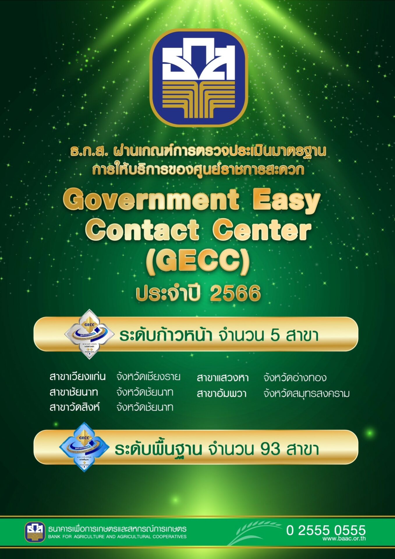 ธ.ก.ส. มุ่งมั่นพัฒนาการให้บริการสู่ความเป็นเลิศทั่วประเทศด้วยมาตรฐาน GECC (Government Easy Contact Center) โดยในปี 2566 มีสาขาที่ผ่านเกณฑ์การรับรองมาตรฐาน จำนวน 98 สาขา จากการตรวจประเมินและให้การรับรองโดยคณะกรรมการอำนวยการศูนย์ราชการสะดวก