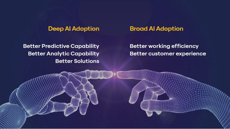 เรื่องของการใช้งาน AI ในวงกว้าง (Broad AI Adoption) ผู้บริหารต้องให้การสนับสนุนให้เกิดการใช้งานอย่างแพร่หลาย ทุกวันนี้มีเครื่องมือต่างๆ ไม่ว่าจะเป็น Generative AI, Microsoft copilot และอื่นๆ อีกมากมาย เราจะเริ่มเห็นการใช้งานสิ่งเหล่านี้ ซึ่งไม่ได้เป็นสิ่งที่ต้องมีความลึก ทุกคนควรนำมาใช้งาน แล้วลองคิดว่าจะใช้อย่างไร เพราะทุกวันนี้เครื่องมือต่างๆ ถูกดีไซน์มาให้ใช้ง่าย ควรจะสนับสนุนให้ทุกคนใช้ให้เกิดประโยชน์ เพื่อช่วยเพิ่มประสิทธิภาพในการทำงาน อันจะนำไปสู่การยกระดับประสบการณ์ลูกค้าของกลุ่มฯ ให้ดียิ่งขึ้น