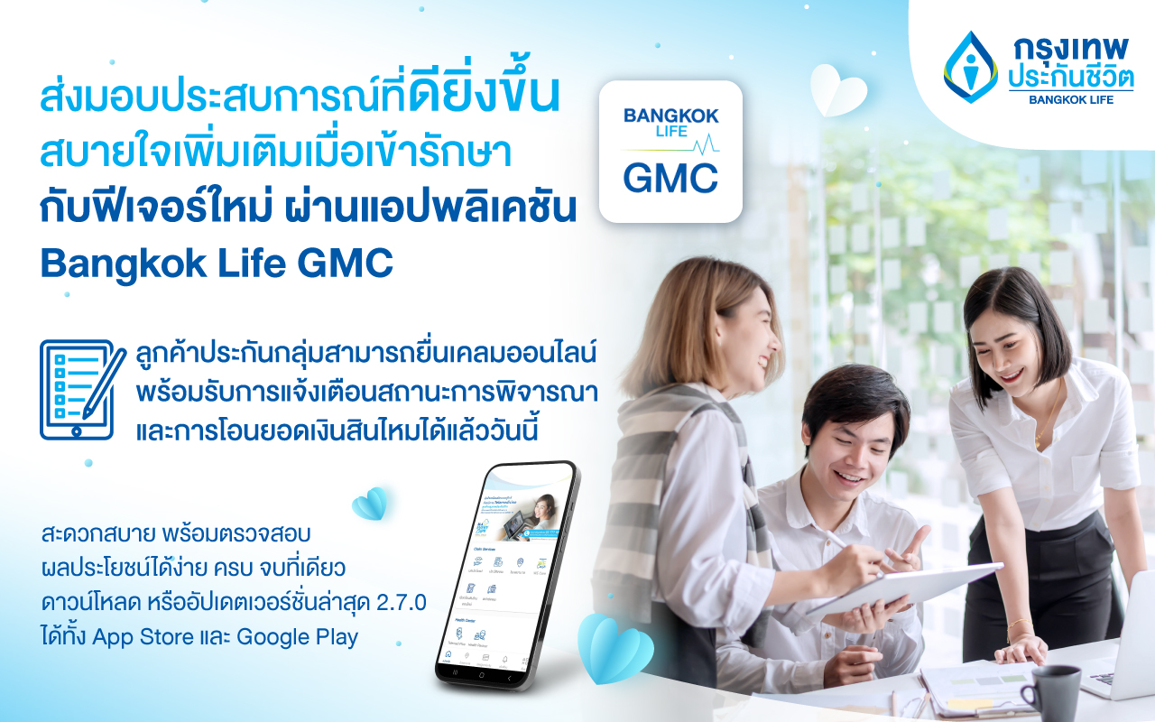 กรุงเทพประกันชีวิต ใส่ใจมุ่งมั่นพัฒนาเพื่อมอบประสบการณ์ที่ดีที่สุดให้แก่ลูกค้า เพิ่มความสะดวกสบายแก่ผู้ถือกรมธรรม์ประกันกลุ่ม ด้วยฟีเจอร์ใหม่ผ่านแอปพลิเคชัน Bangkok Life GMC พร้อมด้วยบริการยื่นเรียกร้องสินไหมออนไลน์ และระบบข้อความแจ้งเตือนสถานะการพิจารณา รวมถึงการโอนยอดเงินสินไหม ยกระดับการบริการที่ตอบโจทย์ผู้เอาประกันยุคใหม่ให้อุ่นใจกว่าที่เคยได้รับ โดยสามารถจัดการทุกเรื่องการเรียกร้องสินไหม พร้อมตรวจสอบผลประโยชน์ได้ง่าย ครบจบที่เดียว