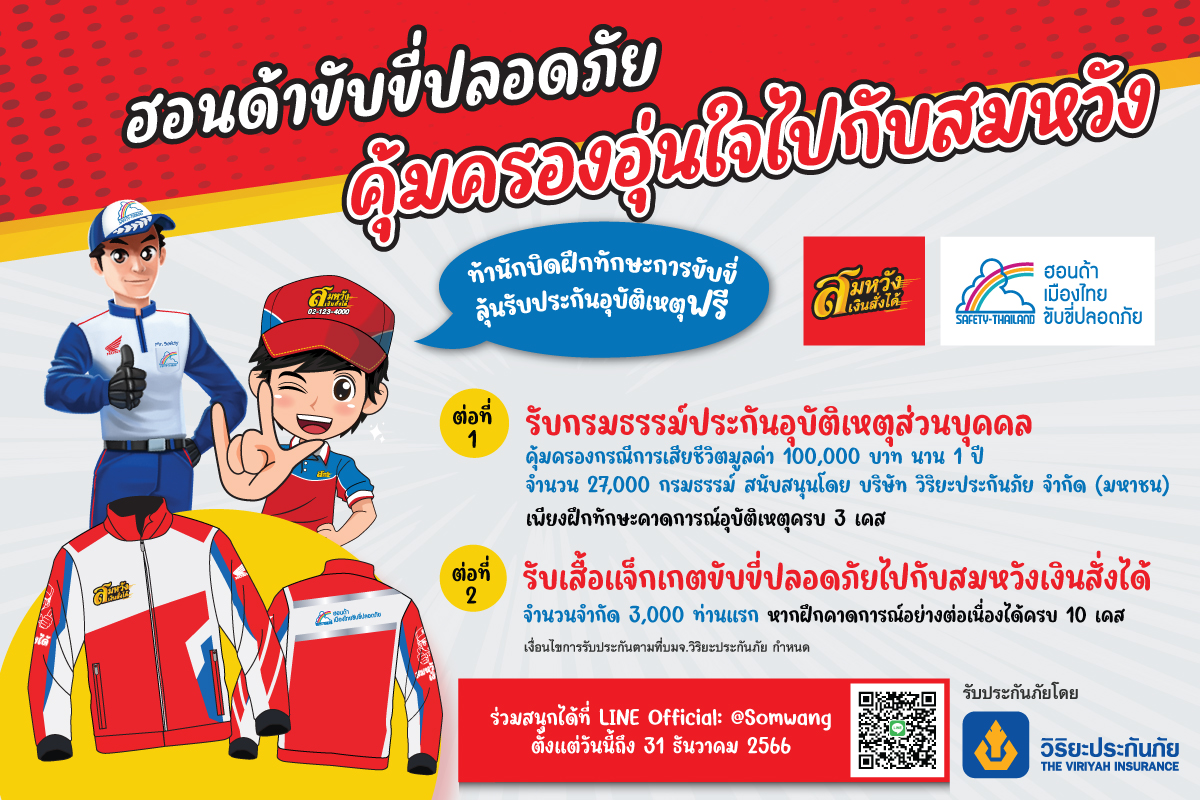 4 ก.ย. 66 – สมหวังเงินสั่งได้ จับมือ ไทยฮอนด้า และ วิริยะประกันภัย สร้างเครือข่ายแนวร่วมป้องกันและลดอุบัติเหตุบนท้องถนน ท้านักบิดฝึกฝนทักษะคาดการณ์อุบัติเหตุพร้อมเรียนรู้หลักการขับขี่ปลอดภัย ในโครงการ “ฮอนด้า ขับขี่ปลอดภัย คุ้มครองอุ่นใจ กับสมหวัง” ด้วยโปรแกรมจำลองสถานการณ์การขับขี่จริงจาก Honda APT (Accident Prediction Training) ผ่านแพลตฟอร์ม LINE Official: @somwang พร้อมลุ้นรับรางวัล 2 ต่อ ต่อที่ 1 กรมธรรม์ประกันอุบัติเหตุส่วนบุคคล มูลค่าความคุ้มครอง 100,000 บาท นาน 1 ปี จำนวน 27,000 กรมธรรม์ ต่อที่ 2 เสื้อแจ็กเกตสุดเท่ สำหรับผู้พิชิต 10 ด่าน จำกัดเพียง 3,000 ท่านแรกเท่านั้น สามารถร่วมวัดทักษะขับขี่ปลอดภัยได้ตั้งแต่วันนี้ ถึง 31 ธ.ค.66