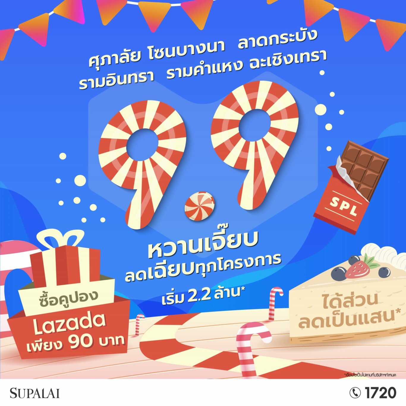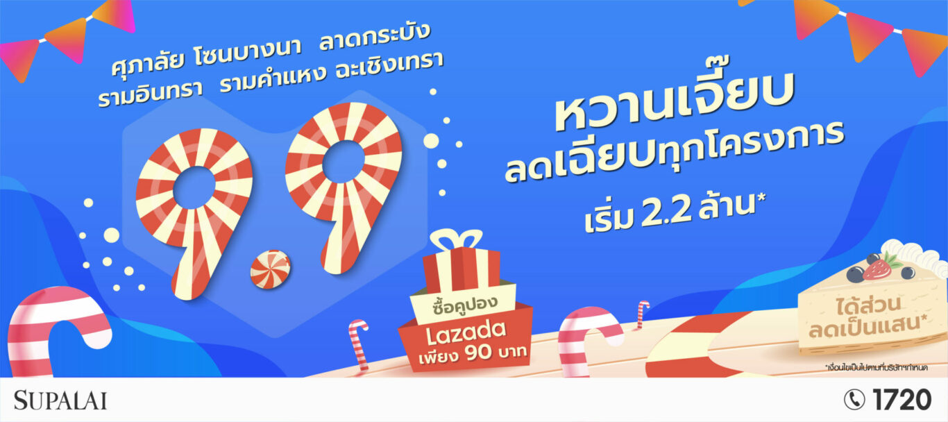 บริษัท ศุภาลัย จำกัด (มหาชน) เอาใจนักช้อปออนไลน์ เปิดตัวแคมเปญพิเศษ “9.9 หวานเจี๊ยบลดเฉียบ ทุกโครงการ” ช้อปสุดคุ้มคูปองศุภาลัยบน Lazada ในราคาเพียง 90 บาท นำมาใช้รับส่วนลดเพิ่มจุกๆ ได้เป็นแสน เมื่อจองบ้านพร้อมอยู่ในโครงการโซนบางนา – ลาดกระบัง – รามอินทรา – รามคำแหง – ฉะเชิงเทรา ราคาเริ่ม 2.2 ล้านบาท* พร้อมรับของแถมอีกมากมาย ตั้งแต่วันนี้ – 31 ตุลาคม 2566