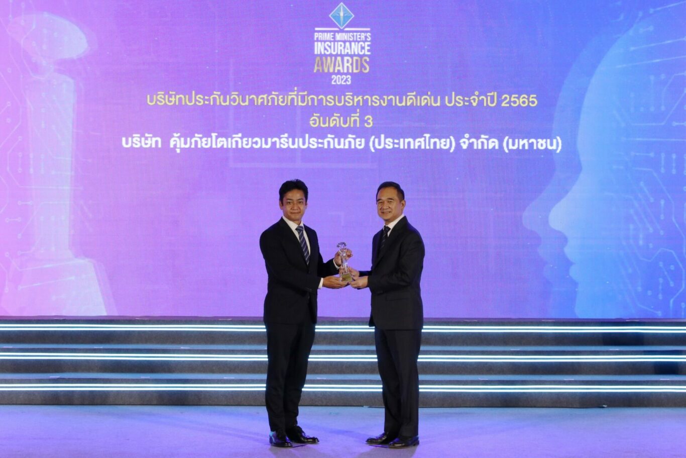 บมจ. คุ้มภัยโตเกียวมารีนประกันภัย (ประเทศไทย) โดยนายโนบุฟูมิ ยาซุเอะ ประธานเจ้าหน้าที่บริหาร เข้ารับรางวัลบริษัทประกันวินาศภัยที่มีการบริหารงานดีเด่นอันดับที่ 3 ประจำปี 2565 จาก นายกฤษฎา จีนะวิจารณะ รัฐมนตรีช่วยว่าการกระทรวงการคลัง ในพิธีมอบรางวัลประกันภัยดีเด่นครบวงจร (Prime Minister’s Insurance Awards) ซึ่งจัดขึ้นภายในงาน Thailand Insure Tech Fair ประจำปี 2566 ณ ห้องฟินิกซ์ ศูนย์การแสดงสินค้าและการประชุมอิมแพ็ค เมืองทองธานี เมื่อวันศุกร์ที่ 8 กันยายน 2566