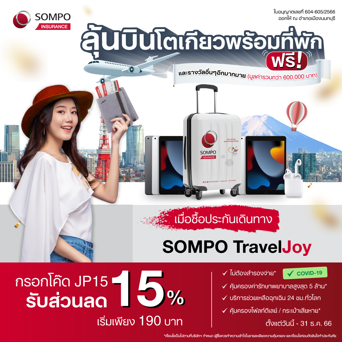 ซมโปะ ประกันภัย มีโปรโมชั่นพิเศษสำหรับประกันเดินทาง ‘ซมโปะ ทราเวลจอย’ (Sompo TravelJoy) เมื่อซื้อออนไลน์ รับลดค่าเบี้ยทันที 15% ทุกแผนประกัน เพียงใส่โค้ด JP15 ตั้งแต่วันนี้ – 31 ธันวาคม 2566 โดยสามารถวางแผนการเดินทาง ซื้อล่วงหน้าได้สูงสุด 6 เดือน ผู้ที่ซื้อประกันออนไลน์มีสิทธิ์ลุ้นรางวัลใหญ่ทุกกรมธรรม์ โดยจะประกาศผลรางวัลครั้งที่ 1 ในวันที่ 3 พฤศจิกายน 2566 และ ครั้งที่ 2 ในวันที่ 5 มกราคม 2567 ผ่าน เฟซบุ๊คเพจ https://www.facebook.com/SompoThailand