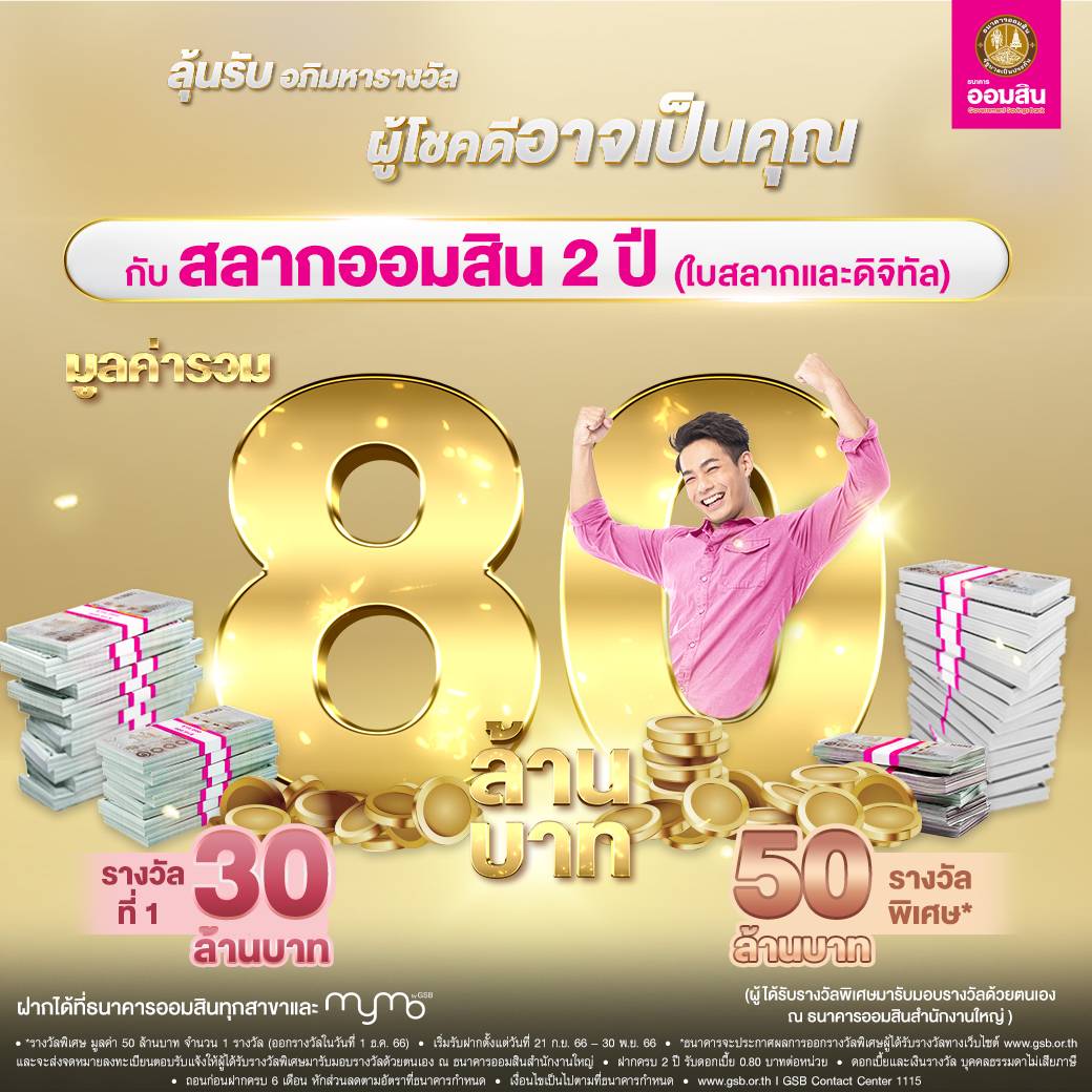 สลากออมสินพิเศษ 2 ปี ทั้งแบบใบสลาก และสลากดิจิทัล รับฝากบุคคลธรรมดาอายุ 7 ปีขึ้นไป และนิติบุคคลทุกประเภท หน่วยละ 100 บาท ระยะเวลาฝาก 2 ปี ฝากครบ 2 ปี ได้รับดอกเบี้ยหน่วยละ 0.80 บาท พร้อมกับเงินต้นที่ฝาก ในช่วงเวลาฝาก 2 ปี มีสิทธิ์ถูกรางวัลที่ 1 เงินรางวัล 30 ล้านบาท รวมถึงรางวัลอื่น ๆ และรางวัลเลขท้าย รวมจำนวน 24 ครั้ง กำหนดการออกรางวัลทุกวันที่ 1 ของเดือน ทั้งนี้ ธนาคารไม่จำกัดวงเงินรับฝากสูงสุด พร้อมกับสิทธิประโยชน์สำหรับผู้ฝากบุคคลธรรมดา ดอกเบี้ยและเงินรางวัลที่ได้รับไม่ต้องเสียภาษี