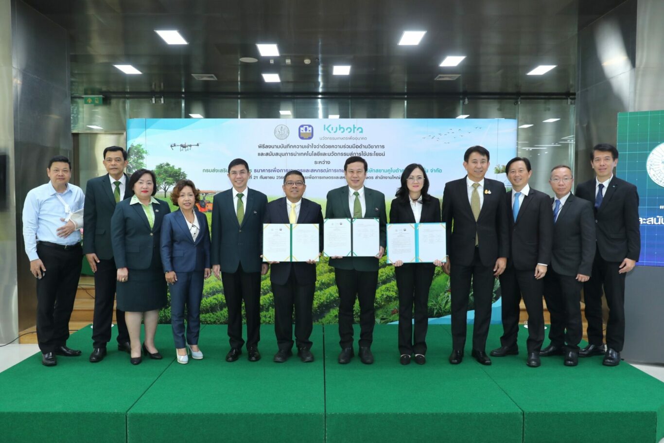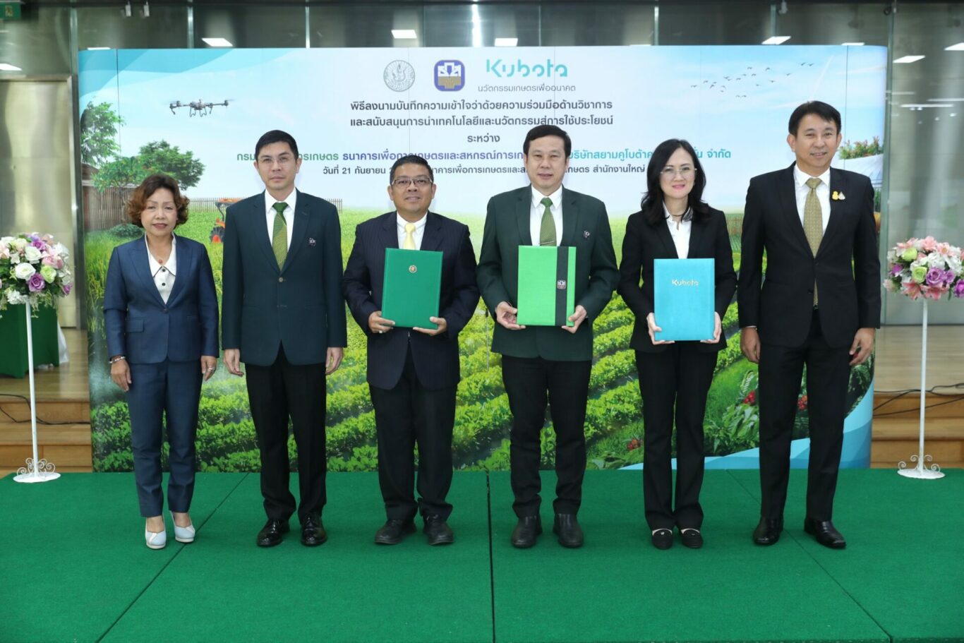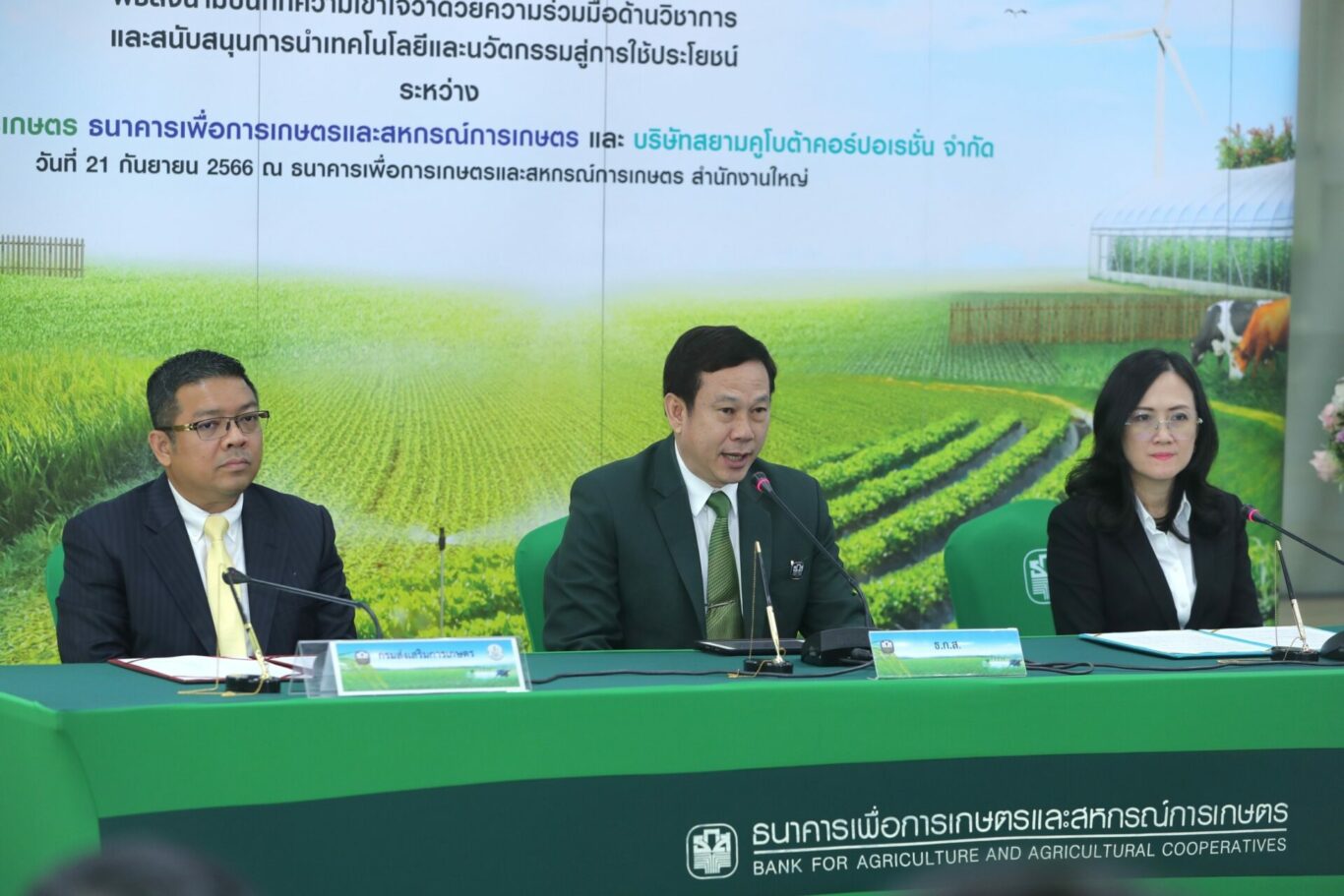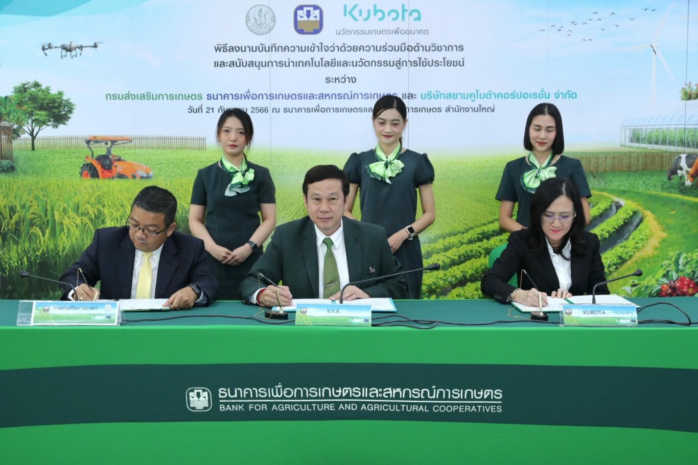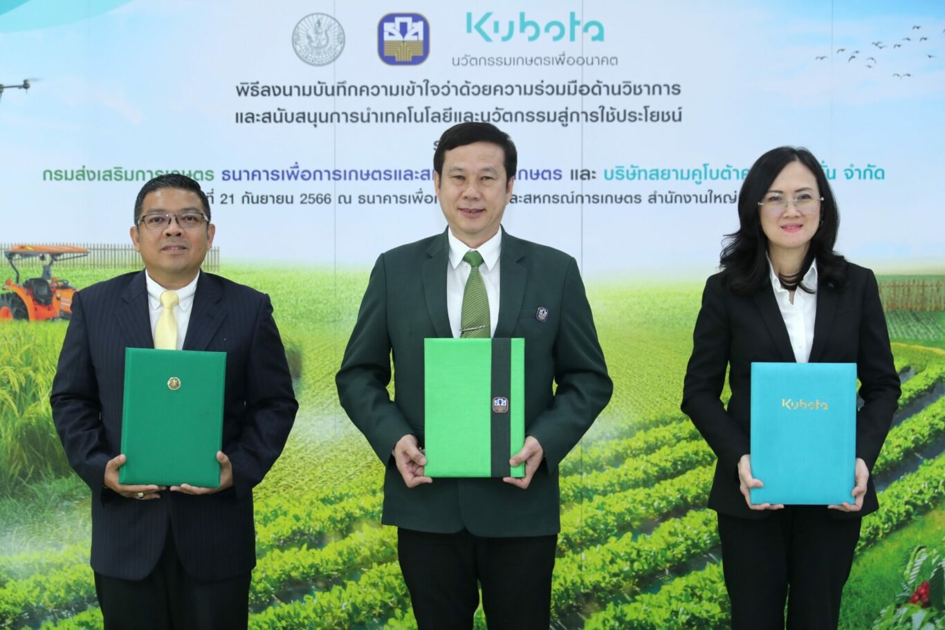 ธ.ก.ส. จับมือ กรมส่งเสริมการเกษตร และ สยามคูโบต้า ขับเคลื่อนภาคเกษตรไทยสู่เกษตรสมัยใหม่ เติมเต็มองค์ความรู้และทักษะด้านนวัตกรรมและเทคโนโลยีให้เกษตรกร เพื่อนำไปสู่การใช้ประโยชน์จริงในเชิงพื้นที่และเชิงพาณิชย์ ต่อยอดการพัฒนามาตรฐานสินค้าไปสู่ตลาดที่มีกำลังซื้อสูงที่ตอบโจทย์ความต้องการลูกค้า พร้อมจัดสินเชื่อ BCG วงเงินรวม 3.5 หมื่นล้าน หนุนการลงทุนด้านเทคโนโลยีที่เป็นมิตรกับสิ่งแวดล้อม สินเชื่อนวัตกรรมดีมีเงินทุน สินเชื่อ เสริมแกร่ง SME เกษตร อัตราดอกเบี้ยร้อยละ 4 และสินเชื่อธุรกิจชุมชนสร้างไทย อัตราดอกเบี้ยล้านละร้อย เพื่อยกระดับคุณภาพชีวิตเกษตรกรและสร้างการเติบโตภาคเกษตรอย่างยั่งยืน