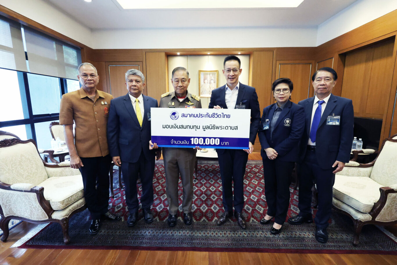 พลอากาศเอก ชลิต พุกผาสุข องคมนตรี กรรมการและเลขาธิการ มูลนิธิพระดาบส (ที่ 3 จากซ้าย) ให้เกียรติรับมอบเงินบริจาคเนื่องในโอกาสการจัดงานวันประกันชีวิตแห่งชาติ ประจำปี 2566 จำนวน 100,000 บาท จากนายสาระ ล่ำซำ นายกสมาคมประกันชีวิตไทย (ที่ 3 จากขวา) พร้อมด้วย นางประภาพร ลิขสิทธิ์ นายกสมาคมตัวแทนประกันชีวิตและที่ปรึกษาการเงิน (ที่ 2 จากขวา) นายพิชา สิริโยธิน ผู้อำนวยการบริหารสมาคมฯ (ขวาสุด) นายจรุง เชื้อจินดา รองผู้อำนวยการบริหารสมาคมฯ (ที่ 2 จากซ้าย) เพื่อเป็นทุนสนับสนุนค่าใช้จ่าย