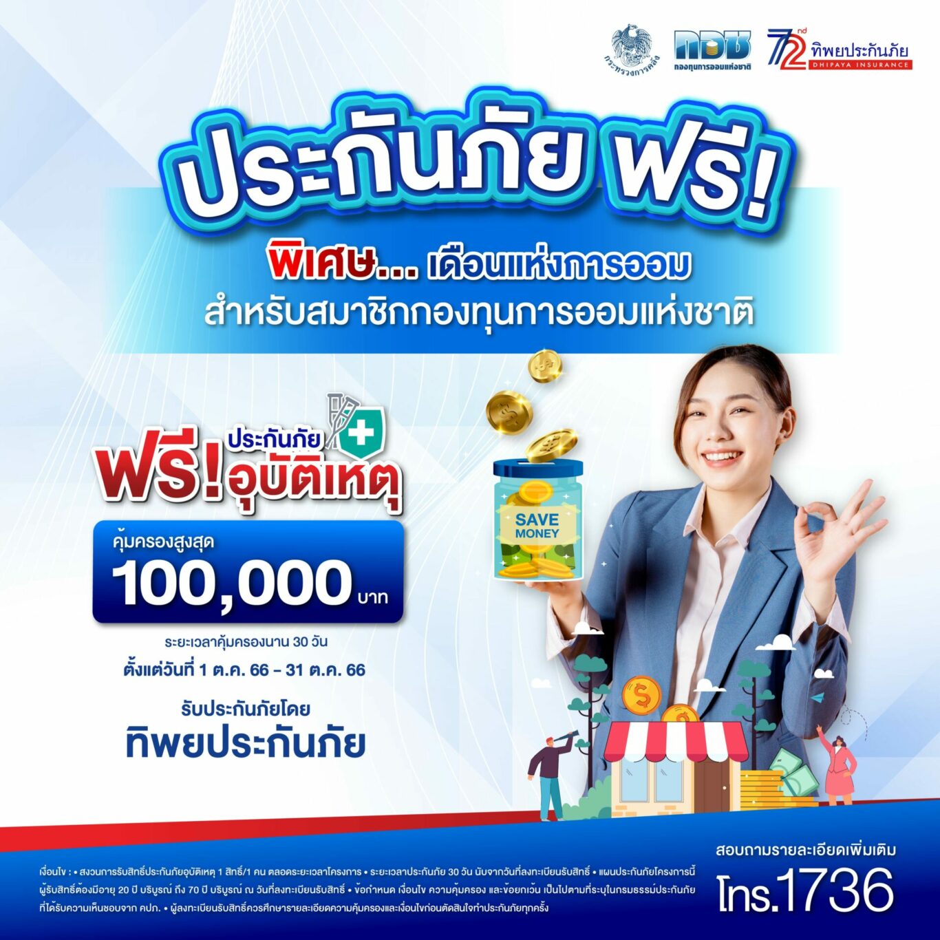 บริษัท ทิพยประกันภัย จำกัด (มหาชน) ร่วมกับ กองทุนการออมแห่งชาติ มอบประกันภัยอุบัติเหตุให้กับสมาชิกกองทุนการออมแห่งชาติ ระยะเวลาความคุ้มครอง 30 วัน (นับจากวันที่ลงทะเบียน) โดยได้รับความคุ้มครองจากอุบัติเหตุ ในวงเงินสูงสุด จำนวน 100,000 บาท (รายละเอียดตามเงื่อนไขกรมธรรม์) สมาชิกกองทุนการออมแห่งชาติ สามารถ Scan QR Code บนสื่อประชาสัมพันธ์ เพื่อลงทะเบียนรับสิทธิ์ได้ตั้งแต่วันที่  1 – 31 ตุลาคม 2566