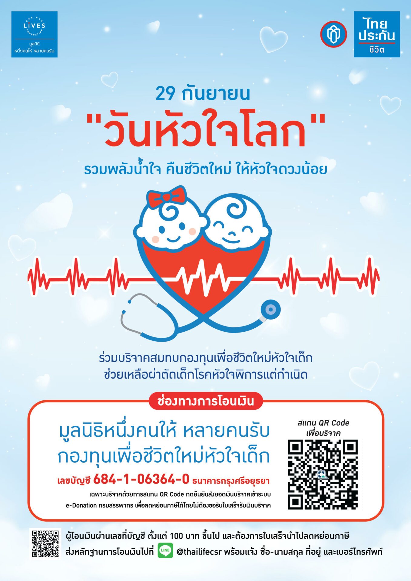 บริษัท ไทยประกันชีวิต จำกัด (มหาชน) และมูลนิธิหนึ่งคนให้ หลายคนรับ ชวนคุณมาร่วมเป็นส่วนหนึ่งในการต่อลมหายใจให้เด็ก ๆ เนื่องในวันหัวใจโลก (World Heart Day) ซึ่งตรงกับวันที่ 29 กันยายนของทุกปีผ่านการร่วมบริจาคสมทบทุนช่วยเหลือผ่าตัดเด็กโรคหัวใจพิการแต่กำเนิดที่ขาดแคลนทุนทรัพย์ โดยสามารถบริจาคได้ที่บัญชี “มูลนิธิหนึ่งคนให้ หลายคนรับ (กองทุนเพื่อชีวิตใหม่หัวใจเด็ก)” เลขที่บัญชี 684-1-063640 ธนาคารกรุงศรีอยุธยา บริจาคเงินตั้งแต่ 100 บาทขึ้นไป