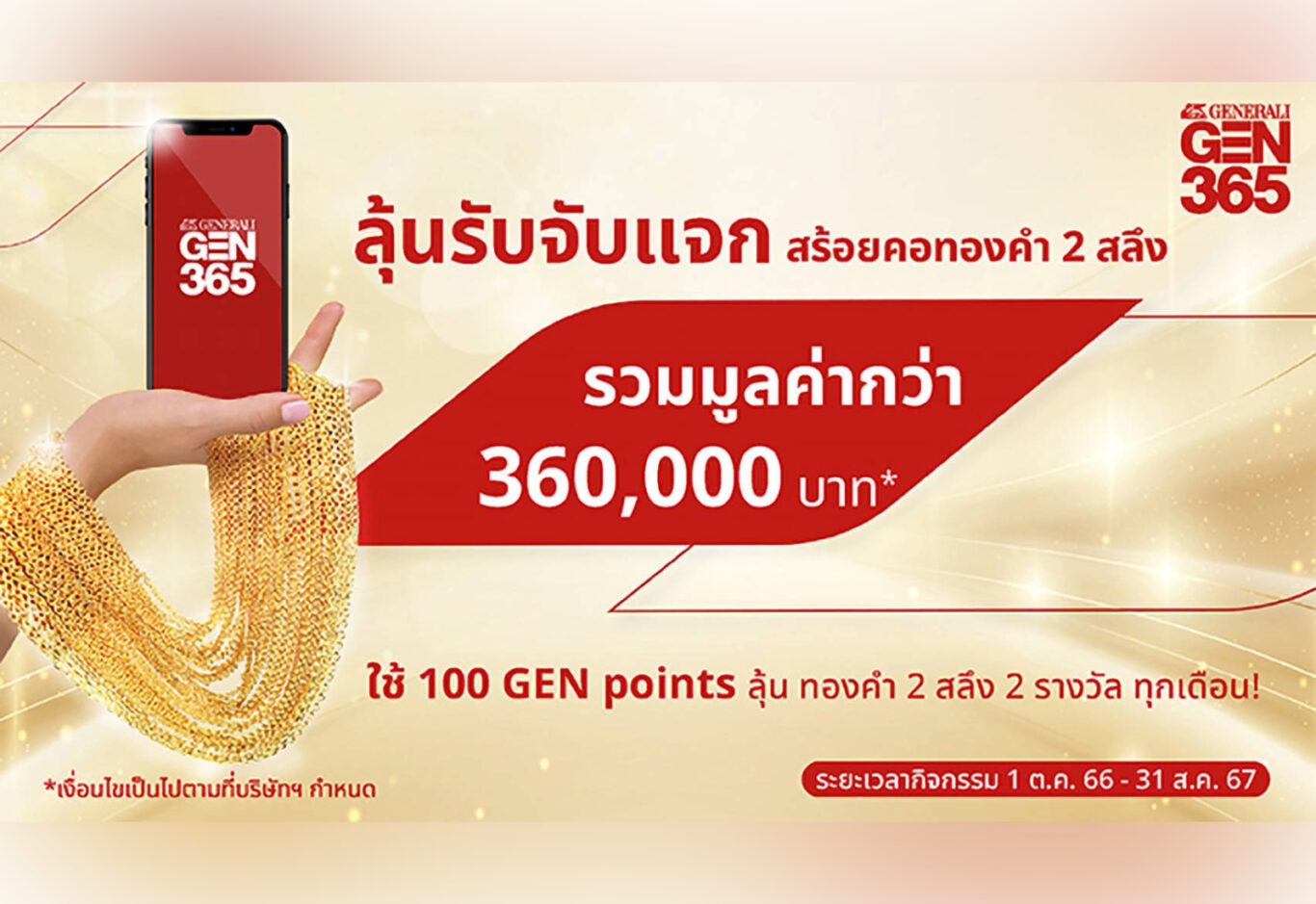 เจนเนอราลี่ ไทยแลนด์ จัดแคมเปญพิเศษ “GEN365 ลุ้นรับจับแจก” ให้กับลูกค้าคนสำคัญ ร่วมลุ้นรับรางวัลสร้อยคอทองคำหนัก 2 สลึง จำนวน 2 รางวัล ทุกเดือน รวมมูลค่ากว่า 360,000 บาท เพียงร่วมสนุกผ่านแอปพลิเคชัน GEN 365 โดยทุก 100 GEN points สามารถแลกรับ 1 สิทธิ์ร่วมสนุก ไม่จำกัดจำนวนครั้งตลอดกิจกรรมนี้ แลกรับสิทธิ์ได้ทุกวันที่ 1-20 ของทุกเดือน ตั้งแต่วันที่ 1 ต.ค. 66 – 20 ส.ค. 67 ทั้งนี้บริษัทฯ จะจับรางวัลทุกวันที่ 25 ของเดือน และประกาศรายชื่อผู้โชคดีที่ได้รับรางวัลทุกวันที่ 27 ของเดือน เวลา 16.00 น. ผ่านทางหน้า เว็บไซต์ https://gen365.page.link/luckydraw23