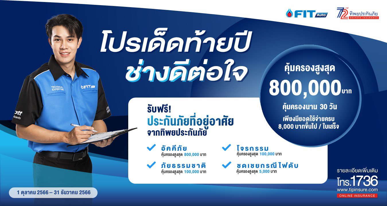 ทิพยประกันภัย ส่งโปรโมชัน “ดีต่อใจดีต่อบ้าน” เข้าร่วมแคมเปญดังกล่าว เพื่อมอบความอุ่นใจไร้กังวลด้วยประกันภัยที่อยู่อาศัย คุ้มครองครบทุกความต้องการ ไฟไหม้ ฟ้าผ่า น้ำท่วม ระเบิด ภัยเนื่องจากน้ำ ลูกเห็บ ลมพายุ แผ่นดินไหว การประท้วง รวมถึงความคุ้มครองอื่น ๆ เช่น การโจรกรรม ความรับผิดต่อบุคคลภายนอก เงินชดเชยค่าที่พักอาศัยชั่วคราว และกรณีไฟฟ้าดับ ให้บ้านและคอนโดของคุณปลอดภัยในทุกเวลา ความคุ้มครองสูงสุดถึง 800,000 บาท นาน 30 วัน ฟรี เมื่อมียอดชำระครบ 8,000 บาทขึ้นไปที่ FIT Auto