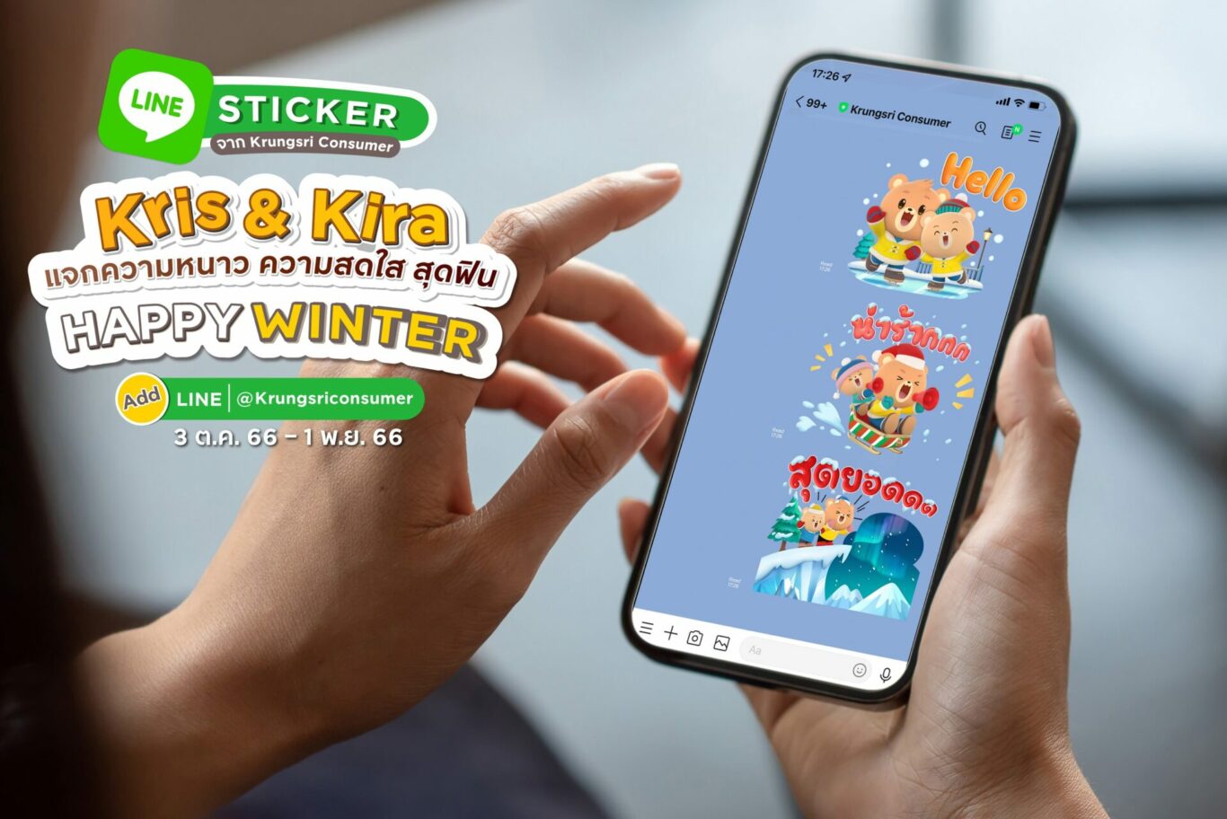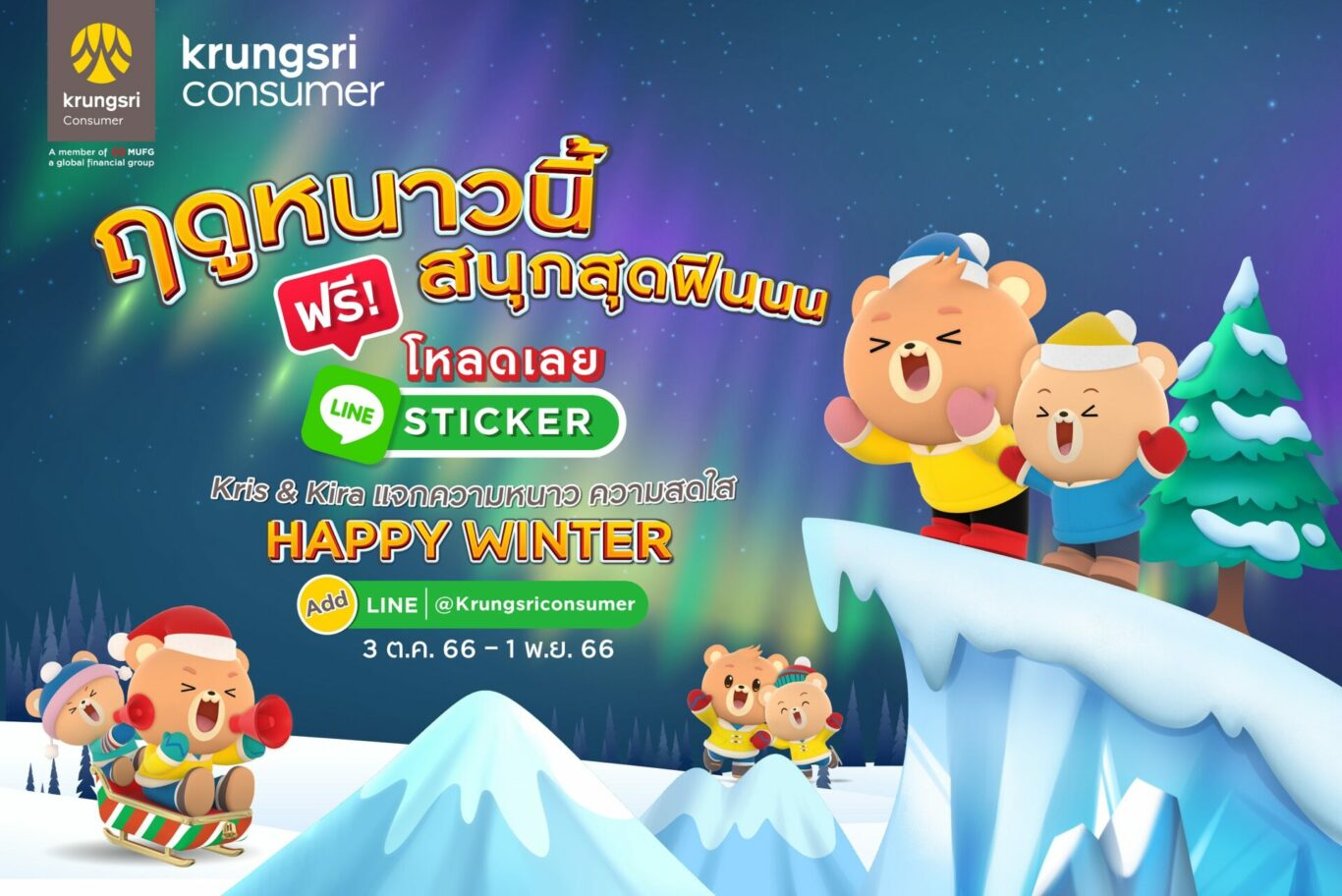 กรุงเทพฯ – 5 ตุลาคม 2566 : กรุงศรี คอนซูมเมอร์ ผู้นำในธุรกิจบัตรเครดิตและสินเชื่อส่วนบุคคล ชวนเพิ่มความสนุกให้ทุกแชทกับสติ๊กเกอร์ไลน์ชุดใหม่ “Kris & Kira Happy Winter” ที่ยกขบวน 8 คาแรกเตอร์สุดคิวท์ พร้อมข้อความน่าใช้จากแก๊งหมี ‘Kris’ และ ‘Kira’ ในธีมฤดูหนาวเพื่อใช้ส่งข้อความบอกความรู้สึกให้กับทุกแชทของคุณและเพื่อน ๆ