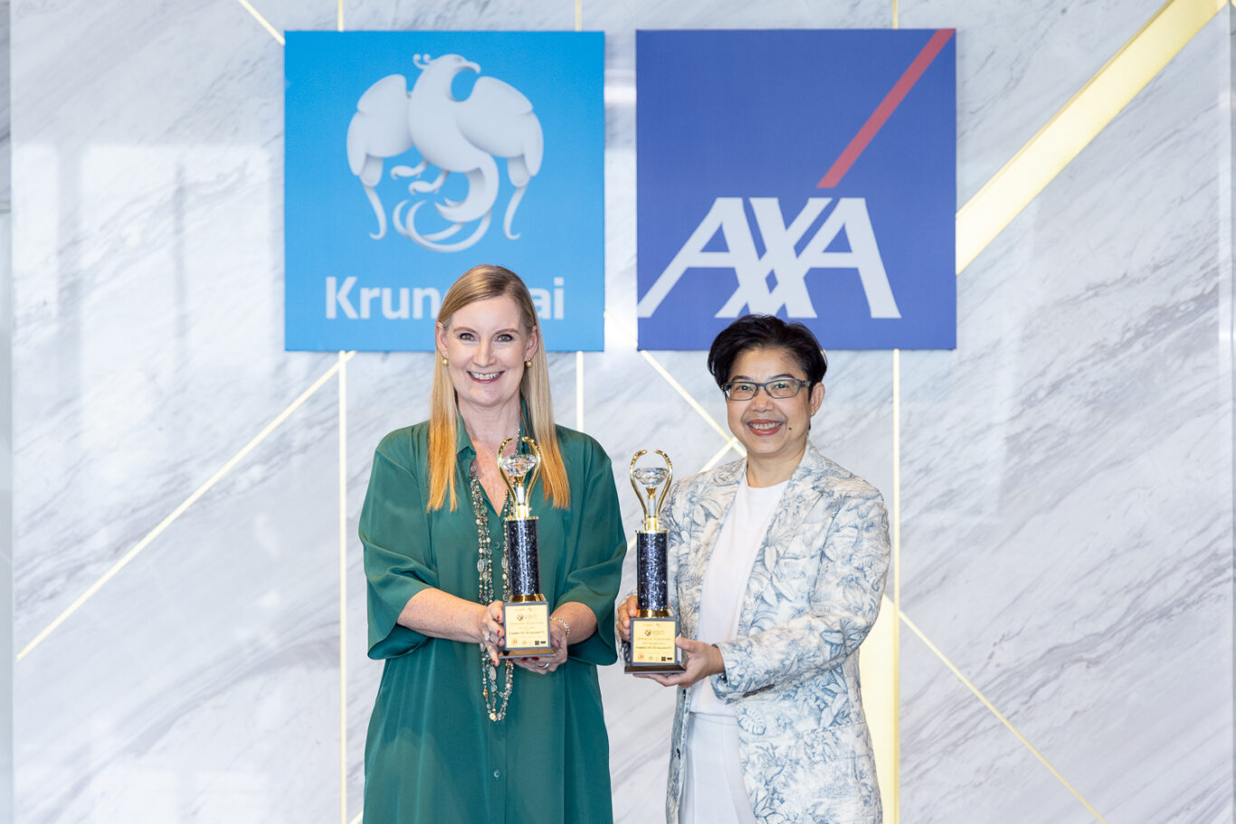 บมจ.กรุงไทย-แอกซ่า ประกันชีวิต โดย นางแซลลี่ โอฮาร่า ประธานเจ้าหน้าที่บริหาร (ซ้าย) และ นางสาวบุปผาวดี โอวรารินท์ ประธานเจ้าหน้าที่บริหาร ฝ่ายทรัพยากรบุคคลและภาพลักษณ์องค์กรและการสื่อสารองค์กร (ขวา) คว้า 2 รางวัลแห่งความสำเร็จด้านทรัพยากรบุคคล สาขา Diversity and Human Resources และ Best Places to Work จาก Global HR Excellence Award