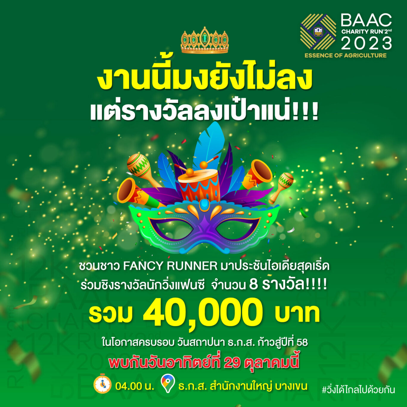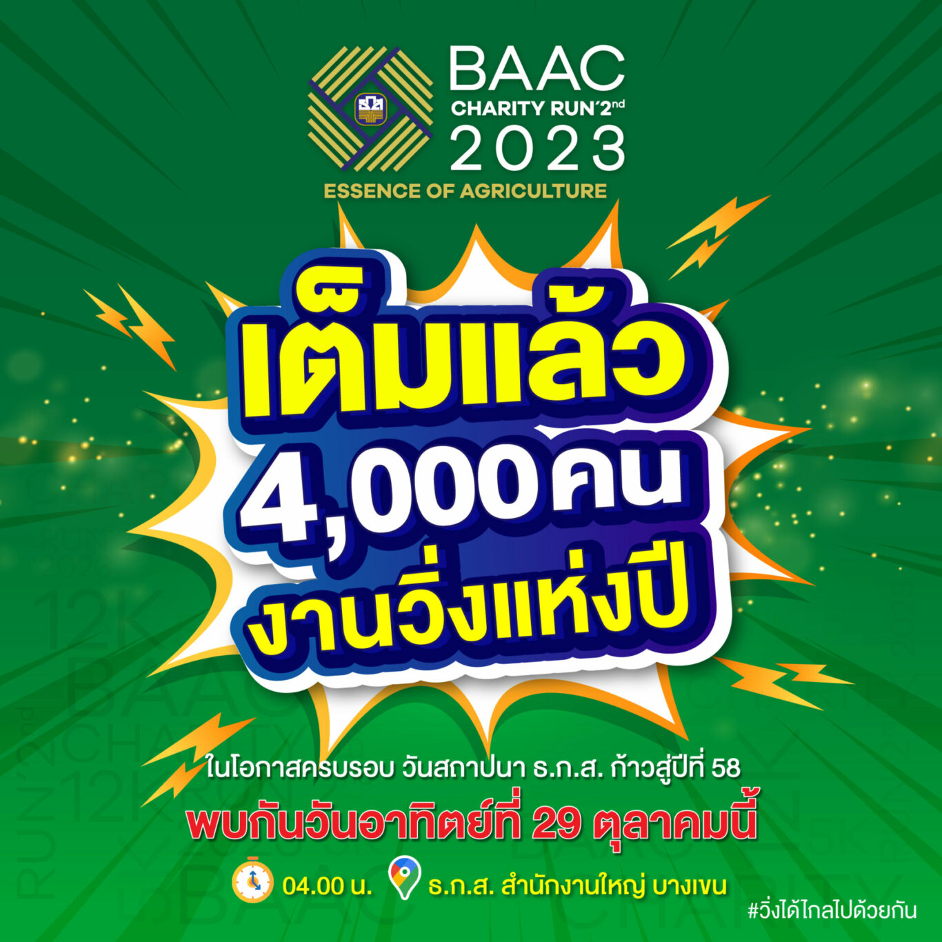 ธ.ก.ส. ขอบคุณผู้สมัคร BAAC Charity Run 2nd 2023 ที่สนใจเข้าร่วมงานจนครบเต็มจำนวนแล้ว 4,000 คน ซึ่งรายได้ทั้งหมดไม่หักค่าใช้จ่ายนำไปบริจาคให้มูลนิธิอาจารย์จำเนียร สาระนาค เพื่อมอบเป็นทุนการศึกษาให้แก่บุตรหลานเกษตรกร พร้อมชิงรางวัลรวมมูลค่ากว่า 2,000,000 บาท และรับของที่ระลึกจาก ธ.ก.ส. มากมาย อาทิ เหรียญที่ระลึก เสื้อวิ่ง และกระเป๋าผ้า พร้อมเชิญชวนเข้าร่วมการแข่งขันประกวดวิ่งแฟนซี สำหรับผู้ที่ออกแบบการแต่งกายสุดสร้างสรรค์และโดนใจกรรมการ จำนวน 8 รางวัล รางวัลละ 5,000 บาท ไม่จำกัดจำนวนผู้สมัคร แล้วเจอกัน ณ จุด Start ธ.ก.ส. สำนักงานใหญ่ เวลา 04.00 น. วันอาทิตย์ที่ 29 ตุลาคมนี้