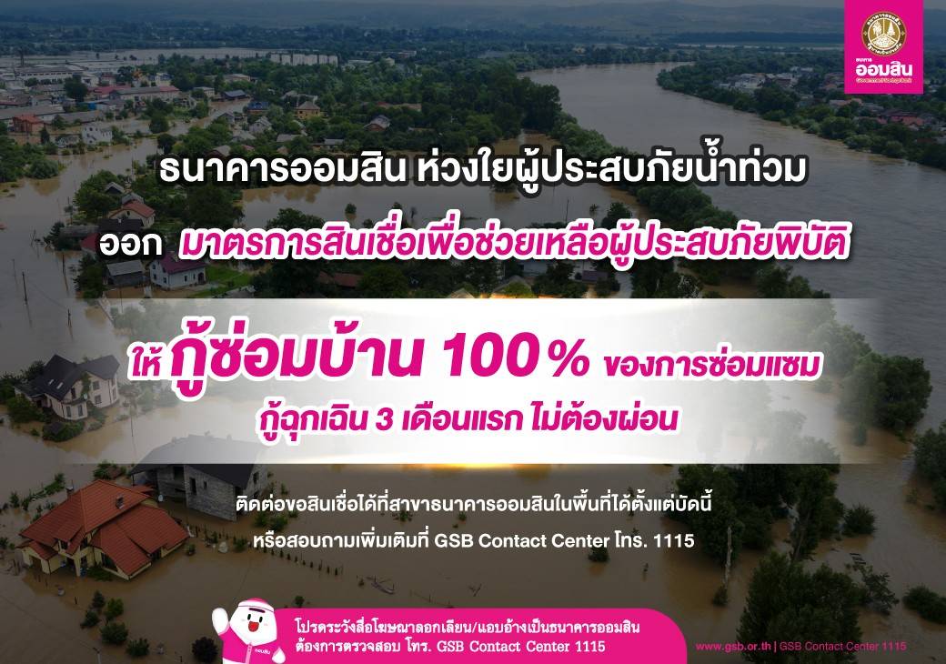 ออมสิน ห่วงใยผู้ประสบภัยน้ำท่วม ออกมาตรการช่วยเหลือฟื้นฟูบรรเทาความเดือดร้อน ให้กู้ซ่อมบ้าน 100% ของการซ่อมแซม ดอกเบี้ยต่ำ ส่วนกู้ฉุกเฉิน 3 เดือนแรก ไม่ต้องผ่อน