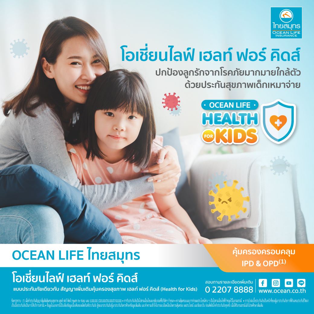 OCEAN LIFE ไทยสมุทร จึงพัฒนาสัญญาเพิ่มเติมคุ้มครองสุขภาพ “โอเชี่ยนไลฟ์ เฮลท์ ฟอร์ คิดส์” (OCEAN LIFE Health For Kids) ประกันสุขภาพเหมาจ่ายสำหรับเด็ก ตอบโจทย์พ่อแม่ที่ห่วงใยลูกรักในยุคโรคระบาดที่อาจติดต่อกันได้ตลอดเวลา หากมีประกันสุขภาพนี้ก็จะช่วยแบ่งเบาค่ารักษาพยาบาล สร้างความมั่นใจให้ลูกรักมีทางเลือกในการรักษาที่มากขึ้น โดยมีความคุ้มครองค่ารักษาพยาบาลผู้ป่วยใน (IPD) แบบเหมาจ่าย ทั้งการเจ็บป่วยและอุบัติเหตุสูงสุด 5,000,000 บาทต่อปี พร้อมความคุ้มครองค่ารักษาพยาบาลแบบผู้ป่วยนอก (OPD) สูงสุด 5,000 บาทต่อปี (เมื่อทำประกันสัญญาเพิ่มเติมคุ้มครองสุขภาพ เฮลท์ ฟอร์ คิดส์ (Health for Kids) แผน 5,000,000 (D20,000/D50,000 /D100,000) และอีกความคุ้มครองที่จำเป็นต้องมี ก็คือความคุ้มครองค่ารักษาพยาบาลผู้ป่วยนอกต่อเนื่อง (OPD follow up) ครอบคลุมการวินิจฉัยโรคแบบ MRI และ CT Scan ที่เกี่ยวข้องโดยตรงและเกิดขึ้นภายใน 30 วัน ก่อนและหลังการเข้าพักรักษาตัวเป็นผู้ป่วยใน เหมาะสำหรับพ่อแม่ที่มีลูกอายุ 30 วัน – 10 ปี (ต่ออายุสัญญาได้ถึงอายุ 19 ปี) เลือกความคุ้มครองได้ 4 แผน ตั้งแต่ 500,000 – 5,000,000 บาท ที่สำคัญเบี้ยประกันสุขภาพสามารถนำไปอ้างอิงลดหย่อนภาษีเงินได้บุคคลธรรมดาได้สูงสุด 25,000 บาทได้อีกด้วย