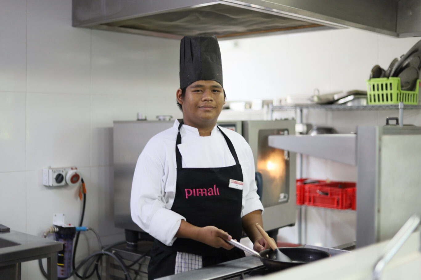 น้องจุก – ประสบโชค ยอดทอง หนุ่มอารมณ์ดีจากจังหวัดหนองคาย แผนกครัว กล่าวว่า “การที่ได้มีโอกาสเข้ามาเรียนที่พิมาลีแห่งนี้ ทำให้ผมได้เข้าใจเกี่ยวกับงานครัวมากขึ้น เข้าใจการทำอาหารอย่างเป็นระบบ ด้วยทุนเดิมที่เป็นคนชอบทำอาหารมากอยู่แล้ว แต่จะเป็นลักษณะคิดเอาเอง แบบที่ว่าลองเอาอันนั้นอันนี้มาลองผสมกันไปมา ทำออกมากินได้บ้างไม่ได้บ้าง เมื่อได้มาเข้าเรียนแล้วก็ทำให้เข้าใจในส่วนผสมต่างๆ มากขึ้น และสามารถนำเอาไปทำอาหารได้อร่อยมากขึ้น เมื่อจบจากที่นี่ก็คิดว่าอยากจะไปทำงานด้านงานครัว เพื่อที่จะได้เตรียมเป็นเชฟในอนาคต และตั้งใจอยากจะมีร้านเล็กๆ ที่สามารถสร้างรายได้และดูแลตัวเองได้ต่อไป”