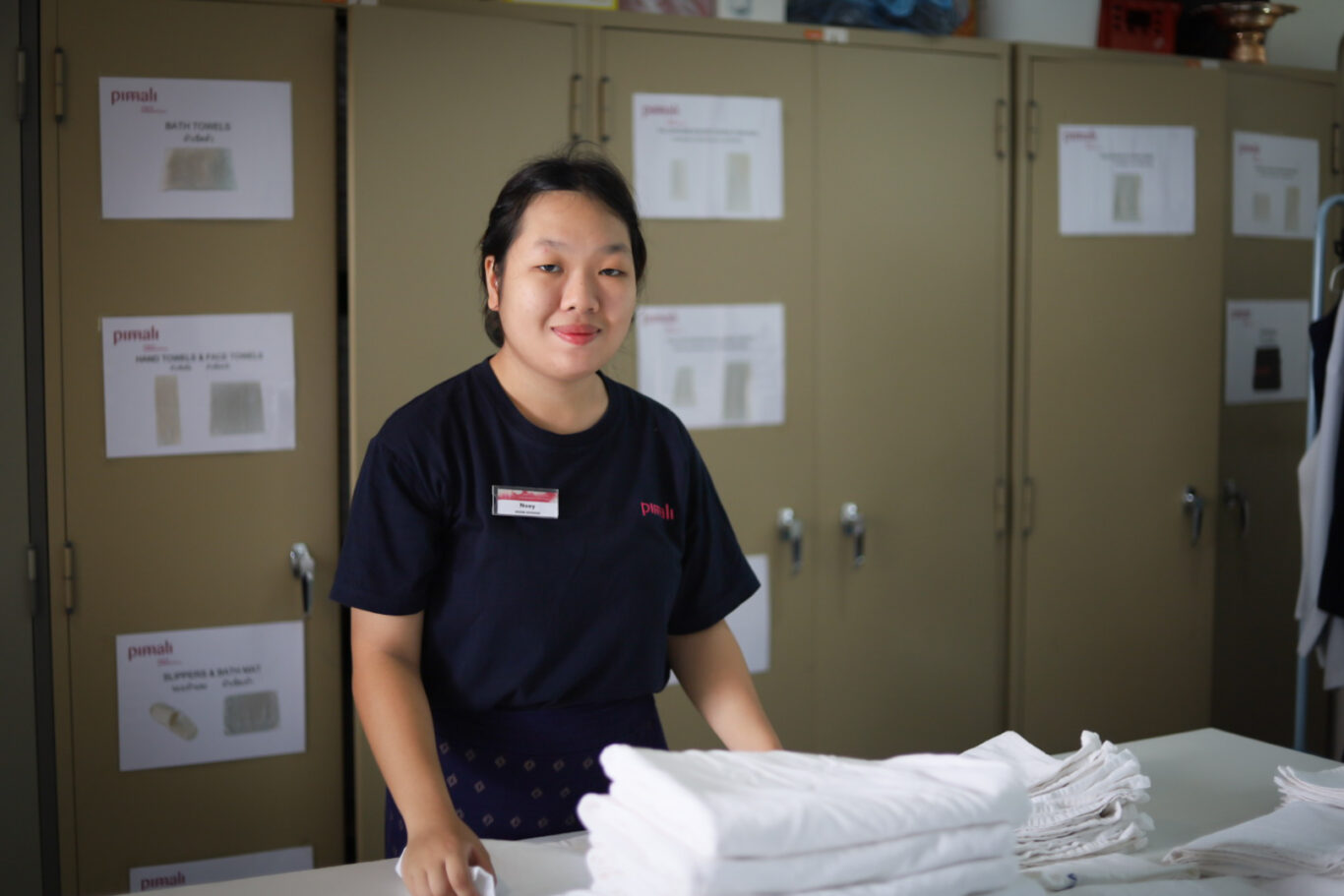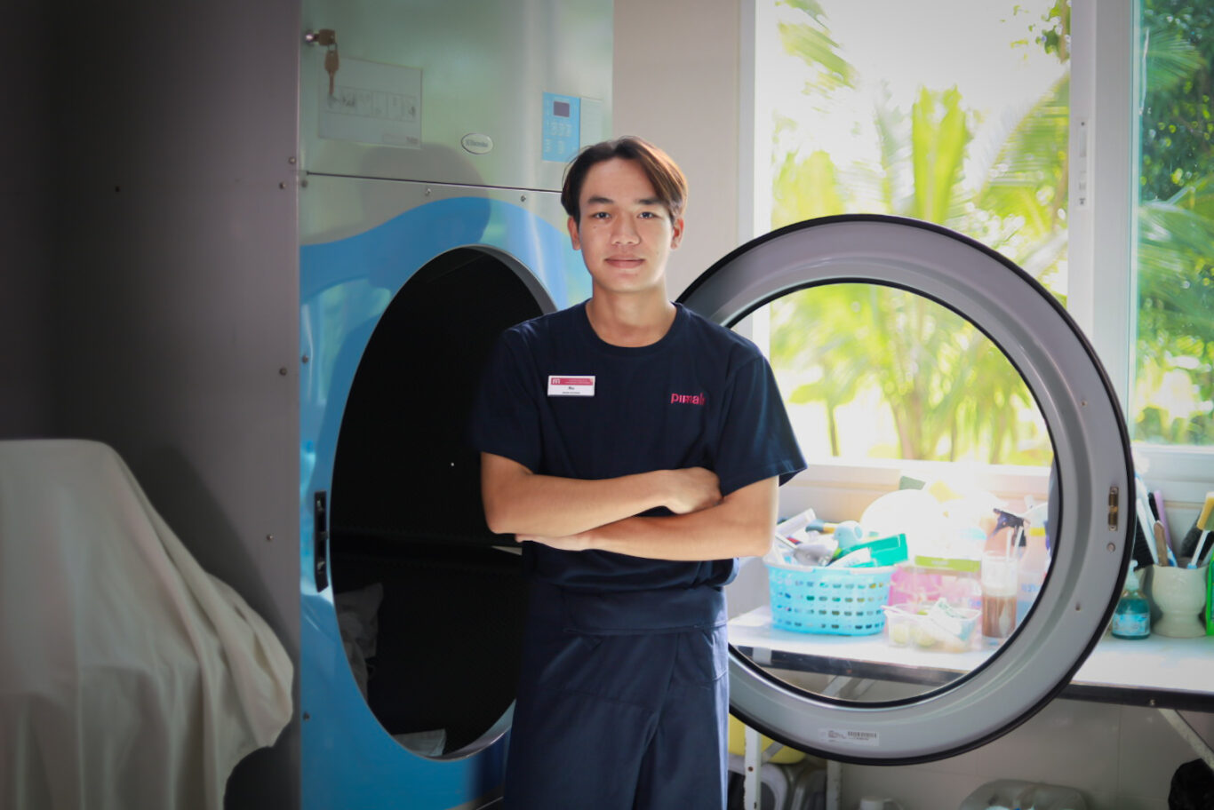 นุ – ภาณุพงษ์ แพงยอด หนุ่มจากจังหวัดสกลนคร แผนกดูแลทำความสะอาด เล่าให้เราฟังว่า “ที่เลือกเรียนแผนกดูแลทำความสะอาด เพราะว่าเป็นคนชอบดูแลห้อง ชอบสร้างบรรยากาศให้ดูน่าพัก เมื่อมีแขกมาเข้าพักได้เห็นห้องพักที่จัดไว้อย่างเรียบร้อย แค่นี้ก็รู้สึกดีมีความสุขที่ได้มีโอกาสดูแลลูกค้าที่เข้าพัก ส่วนตัวชอบการจัดดอกไม้โดยเอาดอกไม้ที่อยู่ในรอบๆ พื้นที่มาจัดตกแต่ง ทำให้รู้สึกสดชื่น ดูแล้วทำให้ห้องสวยงาม เวลาแขกที่มาเข้าพักชมว่า ดอกไม้ที่จัดสวย เราก็ดีใจ”