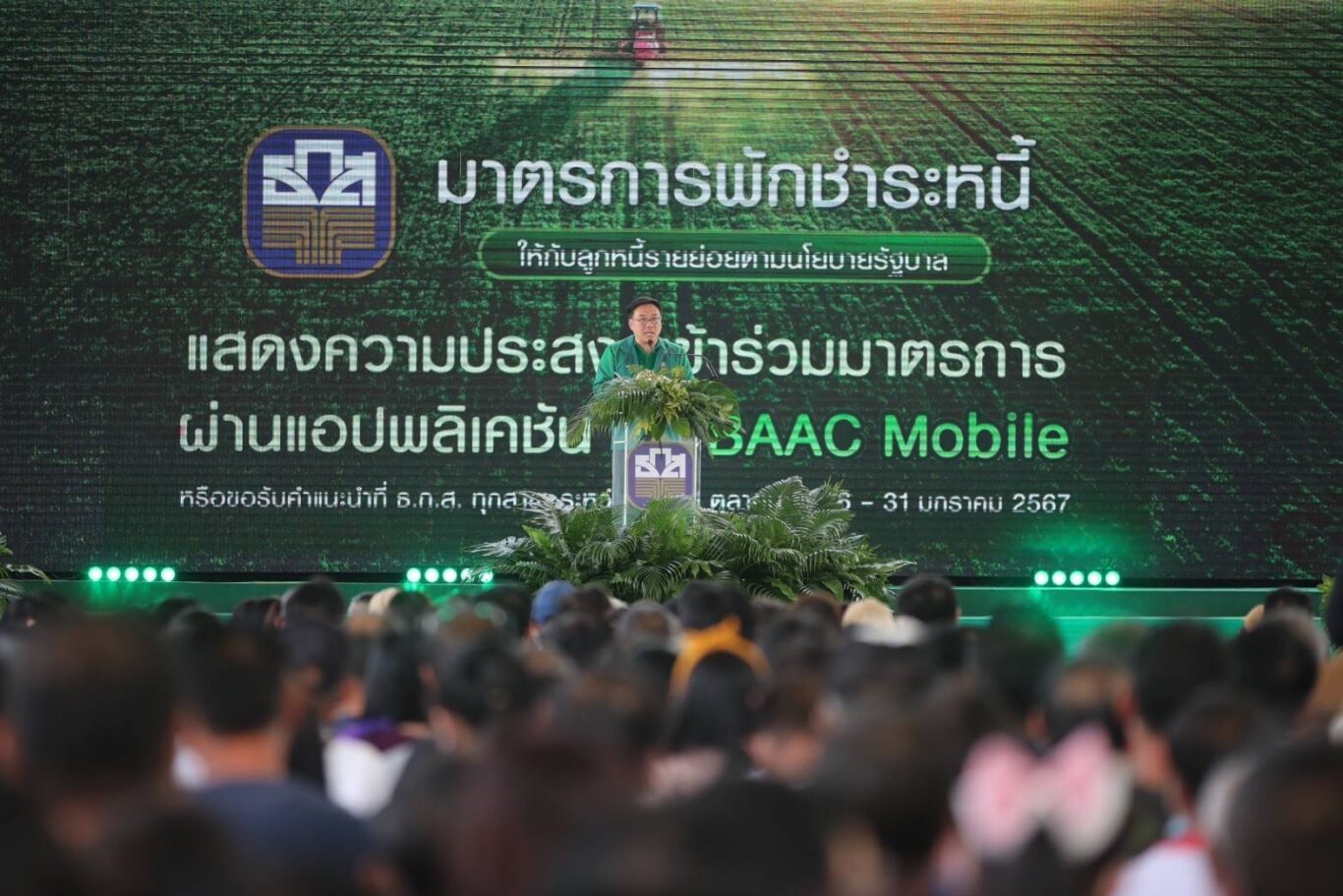 ซึ่ง ธ.ก.ส. เปิดให้บริการตรวจสอบสิทธิ์และแจ้งความประสงค์เข้าร่วมมาตรการผ่านแอปพลิเคชัน “BAAC Mobile” ตั้งแต่วันที่ 1 ตุลาคม 2566 – 31 มกราคม 2567 โดยติดตามขั้นตอนการปฏิบัติงาน ทั้งการตรวจสอบสิทธิ์ การตรวจสุขภาพหนี้ การทำเอกสารข้อตกลงต่อท้ายสัญญา และการฟื้นฟูศักยภาพในการประกอบอาชีพ ภายใต้หลักการ “ตลาดนำ นวัตกรรมเสริม เพิ่มรายได้” พร้อมเติมสินเชื่อเสริมสภาพคล่องในการประกอบอาชีพ วงเงินไม่เกิน 100,000 บาท เพื่อส่งเสริมให้เกษตรกรมีรายได้เพิ่มขึ้นในระหว่างการพักชำระหนี้ และป้องกันการก่อหนี้นอกระบบ โดยมีลูกค้า ธ.ก.ส. ที่เข้าร่วมงานกว่า 1,000 คนณ หอประชุมเทศบาลตำบลสันมหาพล อำเภอแม่แตง จังหวัดเชียงใหม่