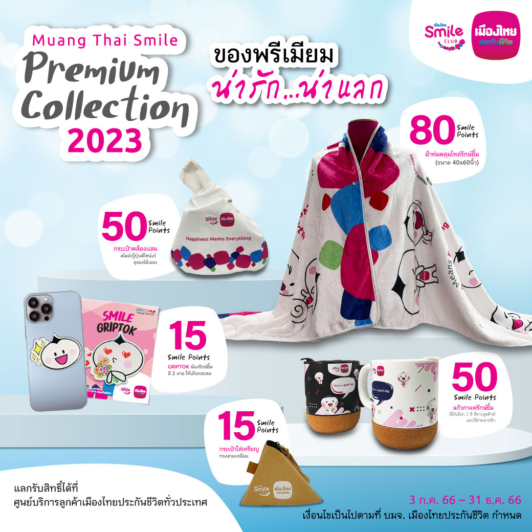 บริษัท เมืองไทยประกันชีวิต จำกัด (มหาชน) โดยเมืองไทยสไมล์คลับ ชวนสมาชิกฯ ร่วมสัมผัสความน่ารักกับของพรีเมียมสุดพิเศษ “Muang Thai Smile Premium Collection 2023” ให้ทุกคนได้เช็กความน่ารัก..น่าแลก กับของพรีเมียมคอลเลกชันใหม่ เพียงใช้คะแนนสะสมเริ่มต้น 15 Smile Points แลกรับไอเทมสุดคิวท์ไม่ซ้ำใครไปอยู่ในอ้อมอกอ้อมใจกัน มีสินค้าให้เลือกถึง 6 ไอเทม ดังนี้ Griptok ที่ติดโทรศัพท์ลายน้องรักษ์ยิ้ม 15 Smile Points, กระเป๋าใส่เหรียญทรงสามเหลี่ยม 15 Smile Points, แก้วกาแฟรักษ์ยิ้ม 50 Smile Points, กระเป๋าคล้องแขนสไตล์ญี่ปุ่น 50 Smile Points และ ผ้าห่มคลุมไหล่รักษ์ยิ้ม 80 Smile Points ขนนุ่มอุ่นเวอร์ (เงื่อนไขเป็นไปตามที่ บมจ. เมืองไทยประกันชีวิต กำหนด) โดยสมาชิกฯ ที่สนใจสามารถใช้สิทธิ์แลกรับของพรีเมียมได้ตั้งแต่วันนี้ ที่ศูนย์บริการลูกค้าเมืองไทยประกันชีวิตทั่วประเทศ