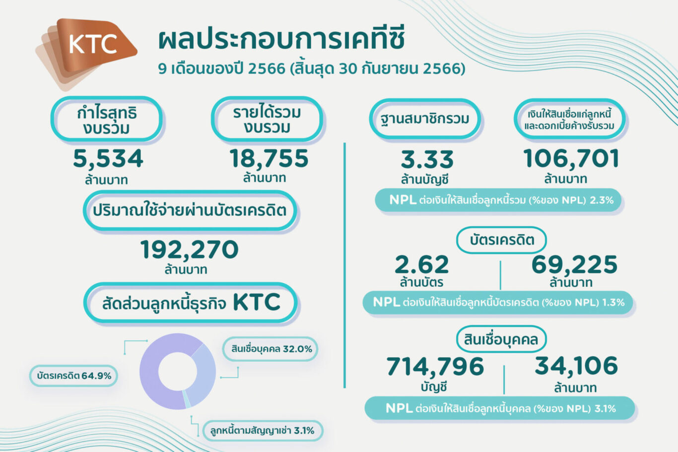 ผลการดำเนินงานของเคทีซี ณ วันที่ 30 กันยายน 2566 เปรียบเทียบกับช่วงเดียวกันของปี 2565 งบการเงินรวมมีกำไรสุทธิในช่วง 9 เดือน และไตรมาส 3/2566 เท่ากับ 5,534 ล้านบาท (เพิ่มขึ้น 2.2%) และ 1,857 ล้านบาท (เพิ่มขึ้น 4.7%) ตามลำดับ ฐานสมาชิกรวม 3,331,065 บัญชี แบ่งเป็นพอร์ตสมาชิกบัตรเครดิต 2,616,269 บัตร เงินให้สินเชื่อแก่ลูกหนี้บัตรเครดิตและดอกเบี้ยค้างรับรวม 69,225 ล้านบาท ปริมาณการใช้จ่ายผ่านบัตรรวม 9 เดือนเท่ากับ 192,270 ล้านบาท เพิ่มขึ้น 13.7% NPL บัตรเครดิตอยู่ที่ 1.3% พอร์ตสมาชิกสินเชื่อบุคคลเคทีซี 714,796 บัญชี เงินให้สินเชื่อแก่ลูกหนี้บัตร กดเงินสด “เคทีซี พราว” และดอกเบี้ยค้างรับ 30,246 ล้านบาท เงินให้สินเชื่อแก่ลูกหนี้ “เคทีซี พี่เบิ้ม รถแลกเงิน” เท่ากับ 2,058 ล้านบาท NPL สินเชื่อบุคคลอยู่ที่ 3.1% ยอดสินเชื่อลูกหนี้ใหม่ (New Booking) ของ “เคทีซี พี่เบิ้ม รถแลกเงิน” ในไตรมาส 3/2566 เท่ากับ 794 ล้านบาท และรอบเก้าเดือนของปี 2566 มีมูลค่า 1,929 ล้านบาท สำหรับสินเชื่อลูกหนี้ตามสัญญาเช่าซื้อมีมูลค่า 3,369 ล้านบาท โดยมียอดปล่อยสินเชื่อใหม่ของรถขนาดใหญ่ที่ใช้ในอุตสาหกรรม (Commercial Loan) ในรอบ 9 เดือนของปี 2566 ที่ 1,446 ล้านบาท ทั้งนี้ เคทีซียังคงชะลอการปล่อยสินเชื่อประเภทนี้ หลังจากที่เห็นสัญญาณของหนี้เสียที่เพิ่มขึ้น