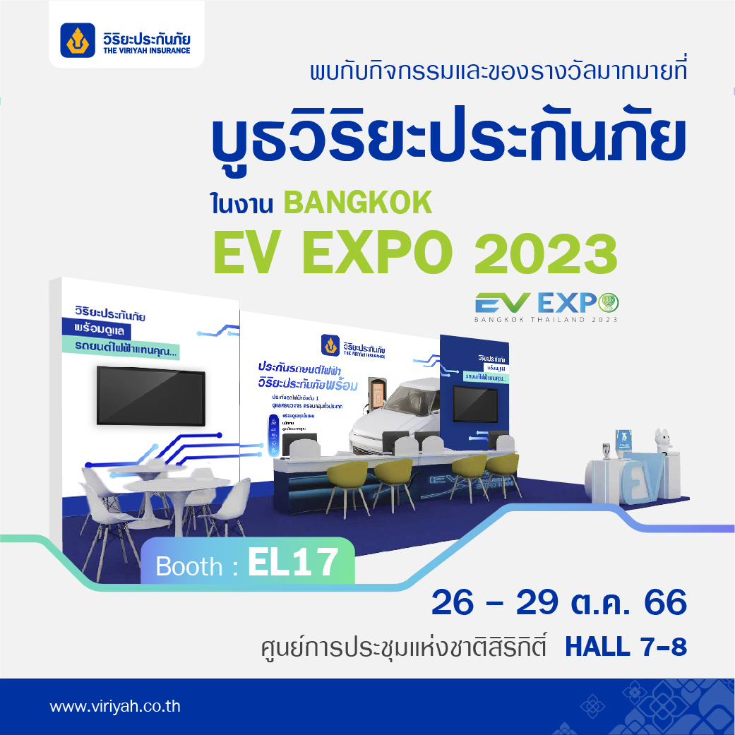 วันที่ 26 – 29 ตุลาคม นี้ บริษัท วิริยะประกันภัย จำกัด (มหาชน) ร่วมจัดแสดงบูธภายในงาน BANGKOK EV EXPO 2023 มหกรรมยานยนต์ไฟฟ้า จัดโดย บริษัท เอ็ม วิชั่น จำกัด (มหาชน) ซึ่งบริษัทฯ ได้ออกบูธกิจกรรมประชาสัมพันธ์ให้ความรู้เกี่ยวกับรถยนต์ไฟฟ้า รวมถึงตอกย้ำความพร้อมของบริษัทฯ ในการให้บริการด้านการรับประกันภัยรถยนต์ไฟฟ้าแบบครบวงจร ด้วยมาตรฐานการให้บริการเดียวกันทุกศูนย์ซ่อมมาตรฐานในเครือวิริยะประกันภัยทั่วประเทศ