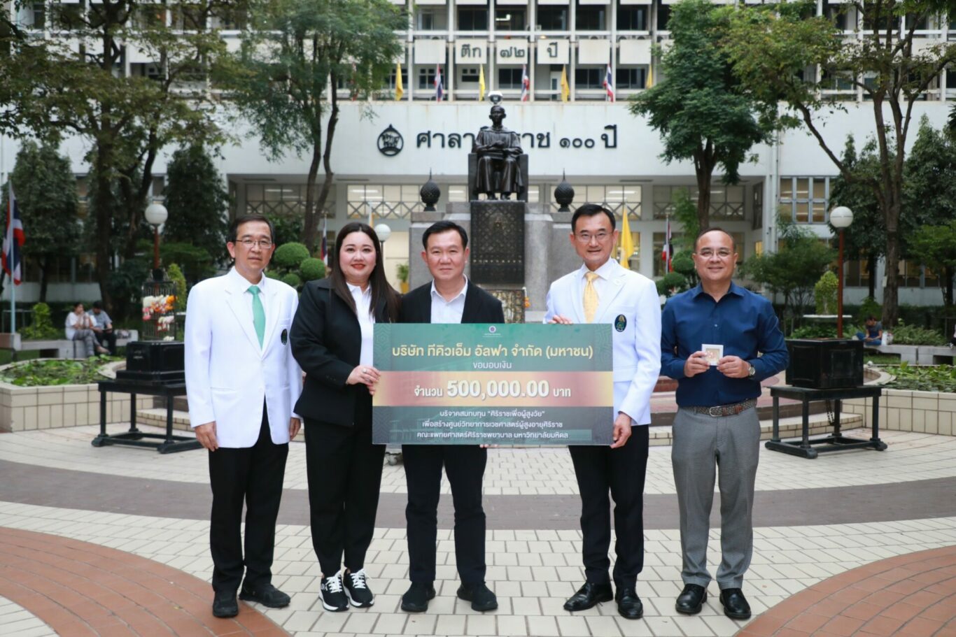 บริษัท ทีคิวเอ็ม อัลฟา จำกัด (มหาชน) โดย ดร.อัญชลิน พรรณนิภา ประธานบริษัท (ลำดับ ที่ 3 จากซ้าย) และ ดร.นภัสนันท์ พรรณนิภา ประธานเจ้าหน้าที่บริหาร (ลำดับที่ 2 จากซ้าย) มอบเงินบริจาค จำนวน 500,000 บาท สมทบทุน “ศิริราชเพื่อผู้สูงวัย” เพื่อสร้างศูนย์วิทยาการเวชศาสตร์ผู้สูงอายุ ศิริราช คณะแพทยศาสตร์ศิริราชพยาบาล มหาวิทยาลัยมหิดล โดยมี ศ.นพ.อภิชาติ อัศวมงคลกุล (ลำดับ ที่ 4 จากซ้าย) คณบดี คณะแพทยศาสตร์ศิริราชพยาบาล มหาวิทยาลัยมหิดล และ ศ.นพ.ธวัชชัย อัครวิพุธ (ลำดับที่ 1 จากซ้าย) รองคณบดี คนที่ 1 และผู้อำนวยการโรงเรียนแพทย์ ศิริราช เป็นผู้แทนรับมอบ เมื่อวันศุกร์ที่ 20 ตุลาคม พ.ศ. 2566 ณ ศาลาศิริราช 100 ปี โรงพยาบาลศิริราช