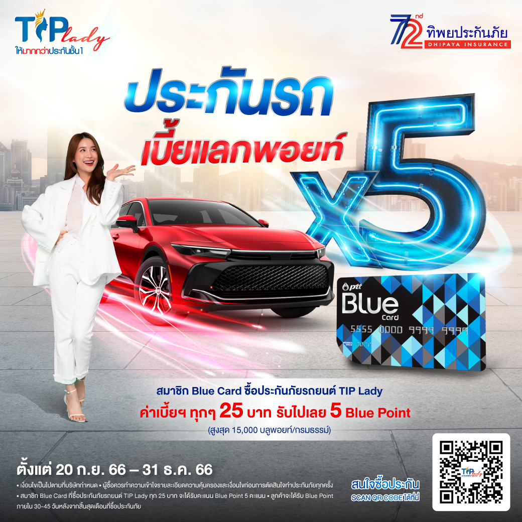 โดยสมาชิกสามารถซื้อประกันภัยรถยนต์ TIP Lady จากทิพยประกันภัย ผ่านช่องทาง Blue Card Mobile Application, Website Bluecard, Application xplORe รับ Blue Point 5 เท่า (เดิม 25 บาท รับ 1 Blue Point, สูงสุด 15,000 บลูพอยท์/กรมธรรม์) พร้อมรับสิทธิ์ ผ่อนชำระ 0% สูงสุด 10 เดือน ผ่านบัตรเครดิตที่ร่วมรายการ*